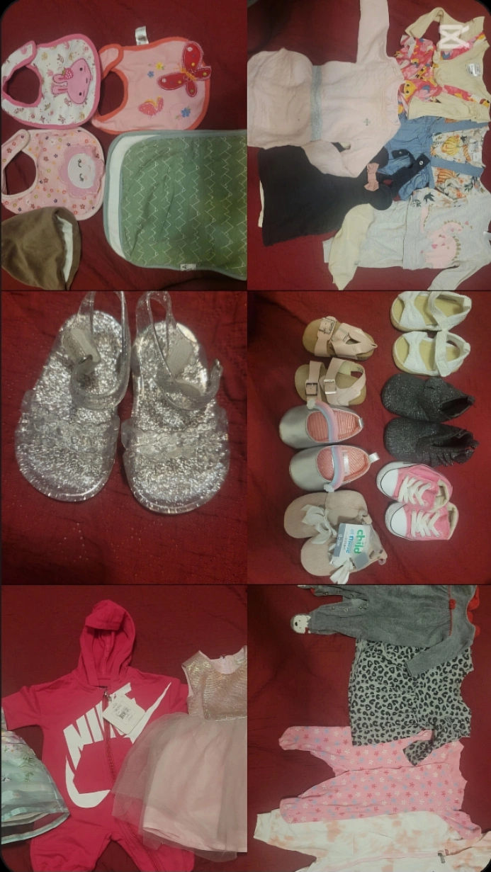 29A cute collection of baby items! Includes bibs, sandals, and a variety of clothing items like onesies, dresses, and outfits. Perfect for your little one!
