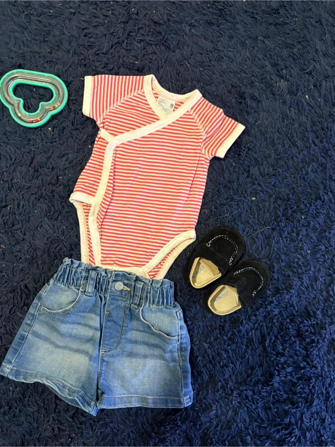 114Cute uniqlo baby clothes set including a striped bodysuit, denim shorts, and a pair of soft shoes. Perfect for your little one!
