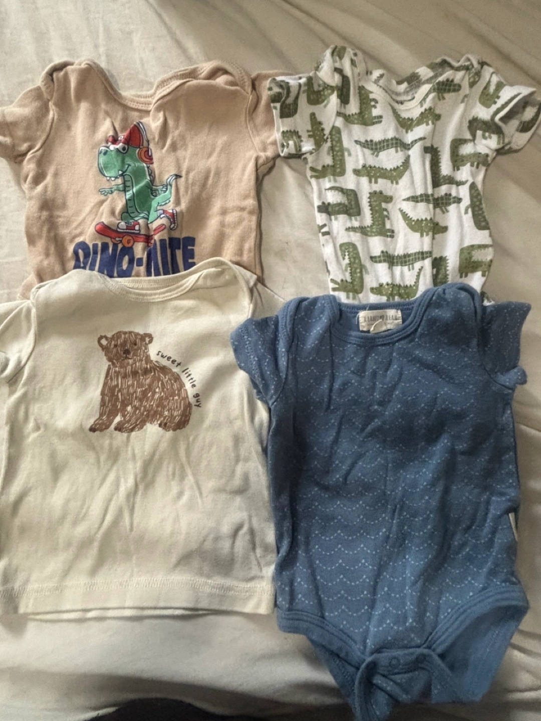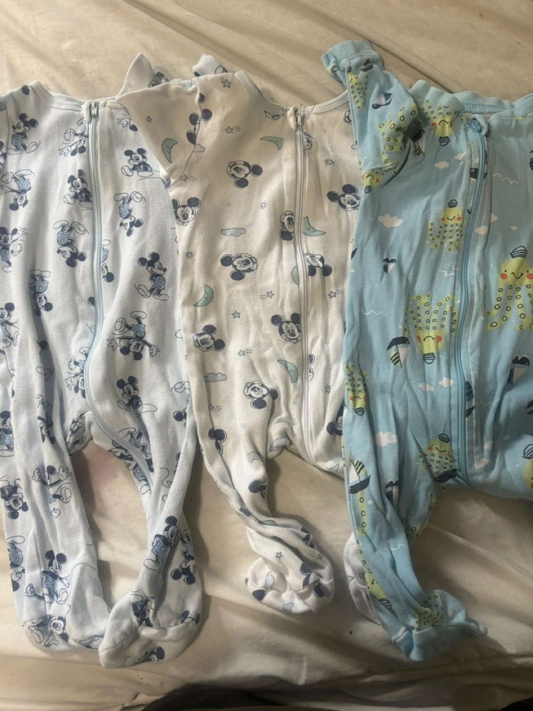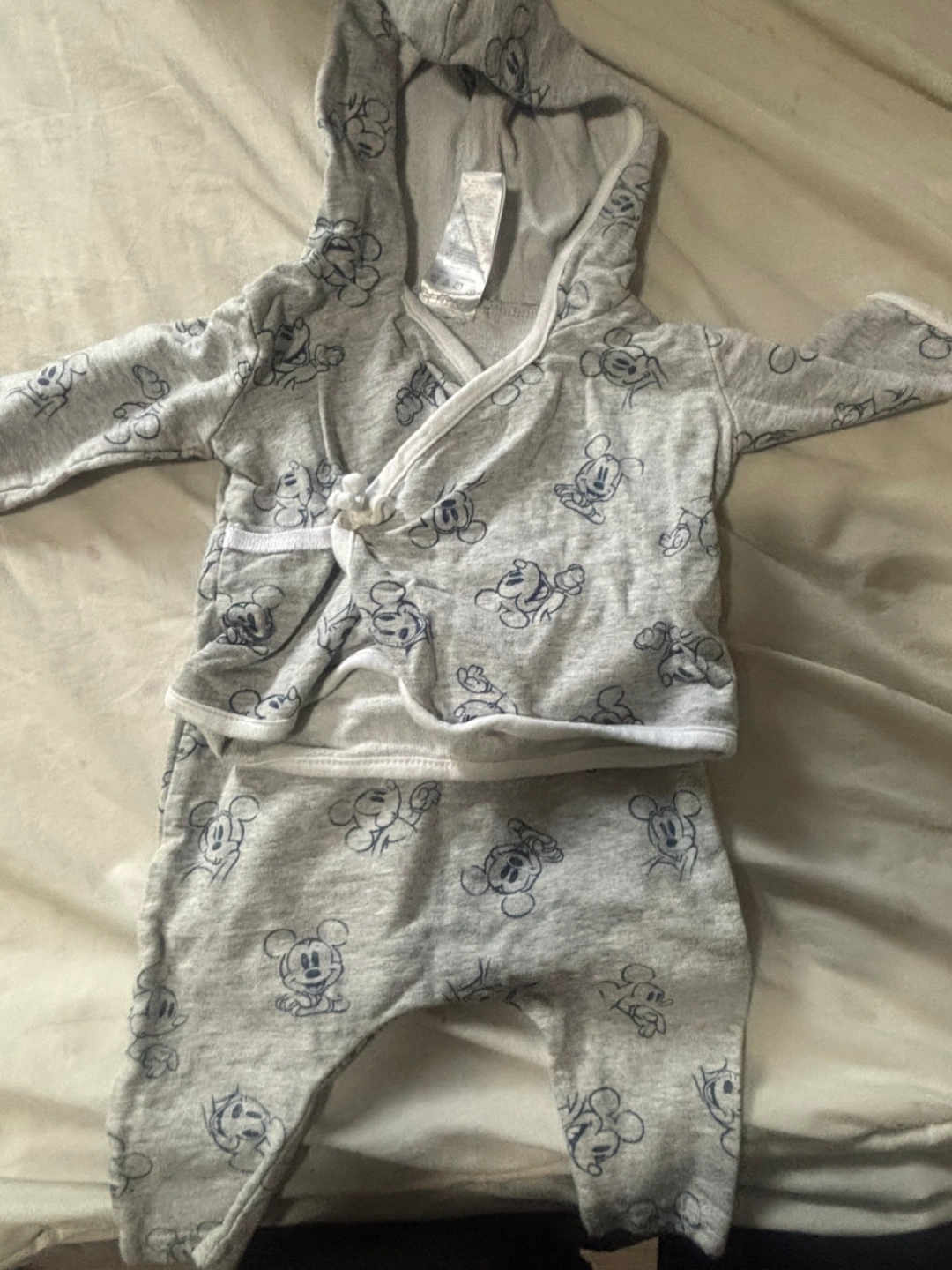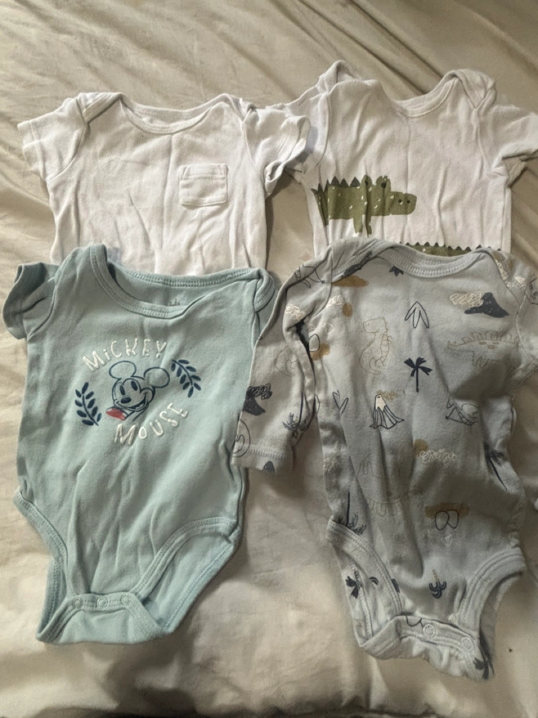 Selling a bundle of gently used baby clothes! There's a mix of onesies, tops, and a cute Mickey Mouse outfit. All in good condition and ready for a new little one to enjoy 0-6