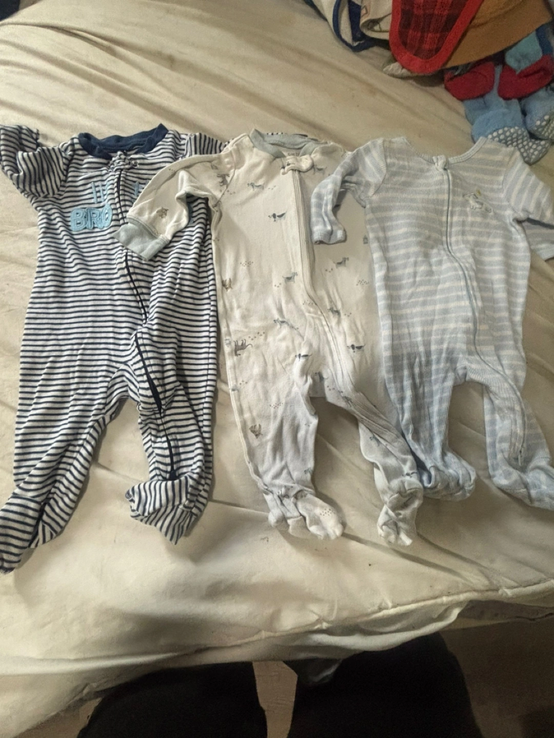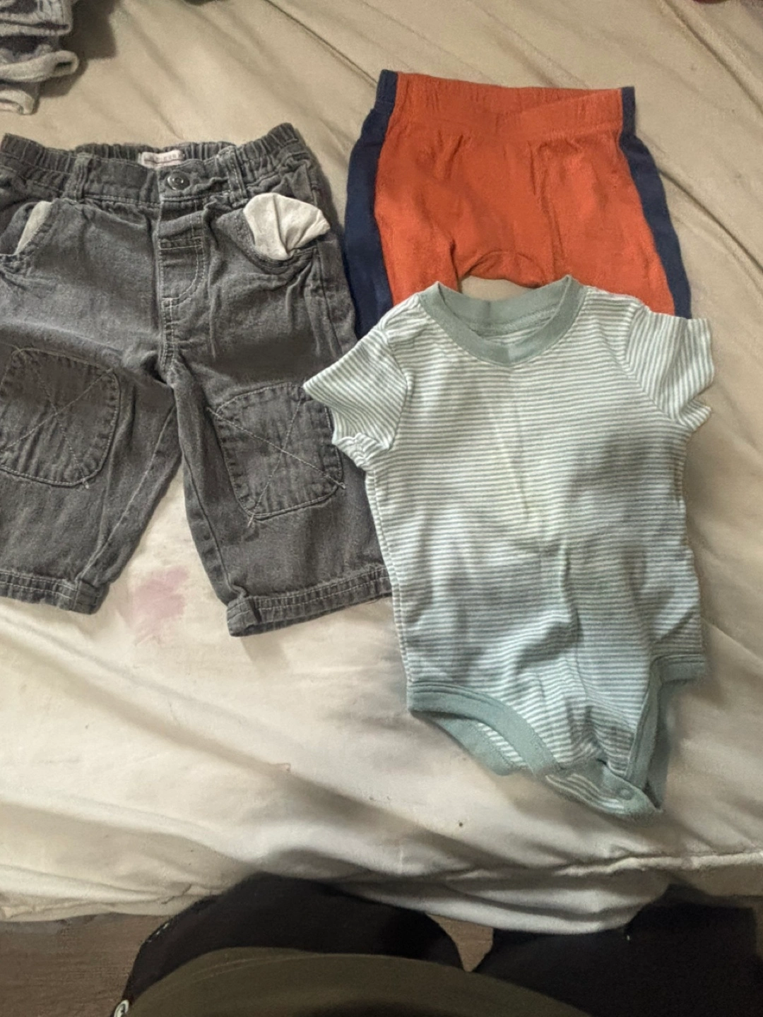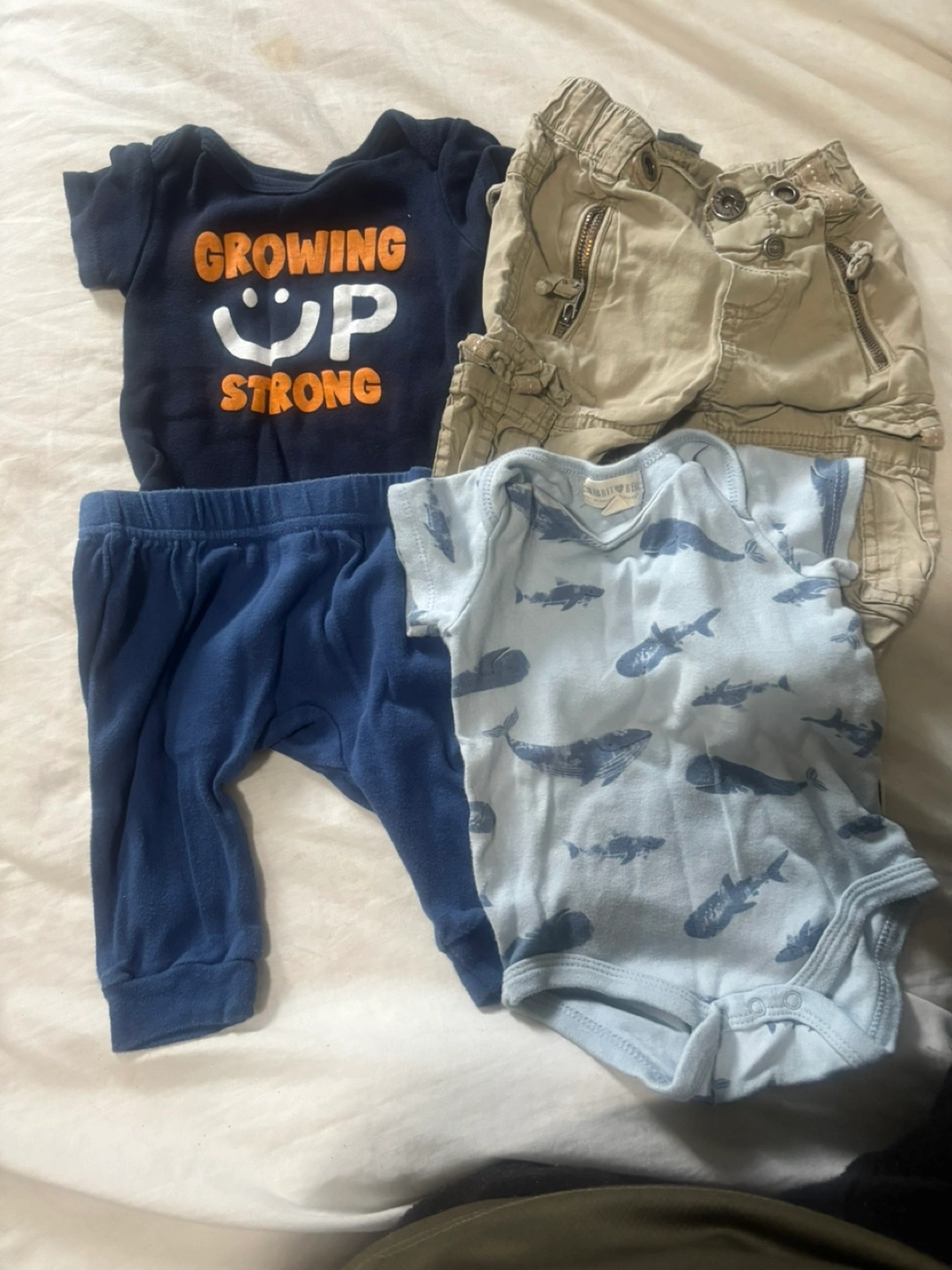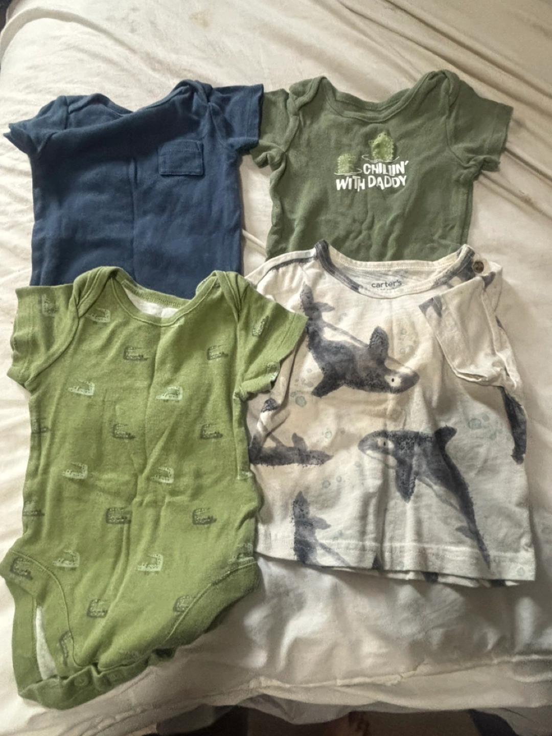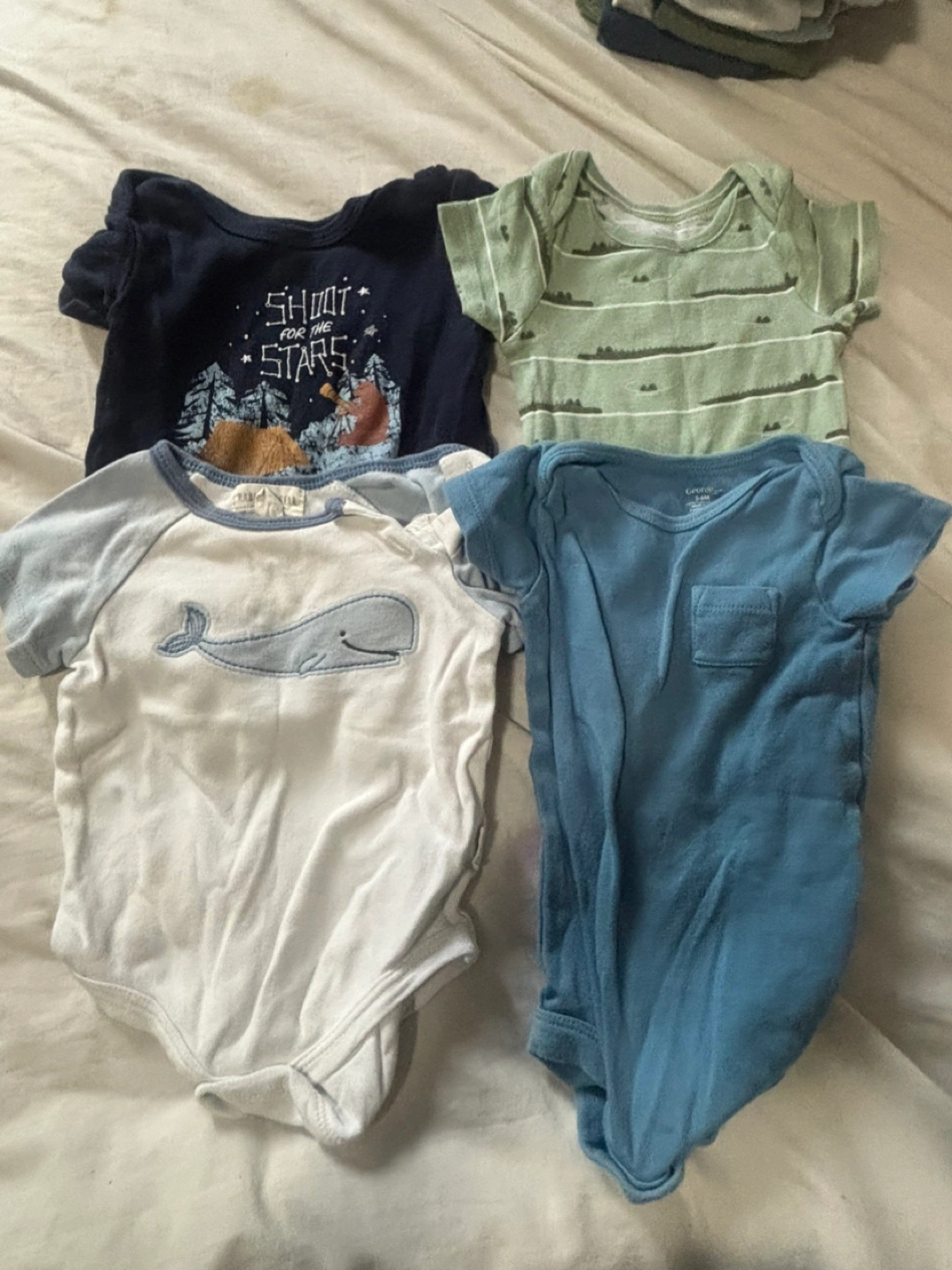 Selling a bundle of gently used baby clothes! There's a mix of onesies, tops, and a cute Mickey Mouse outfit. All in good condition and ready for a new little one to enjoy 0-6