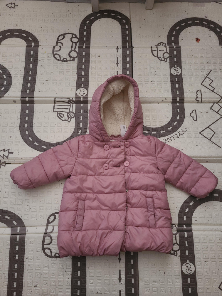 A cute and cozy puffer jacket from Baby Club! It's a lovely shade of pink and features a warm, sherpa-lined hood. The jacket has button closures and is in great condition. Perfect for keeping your little one snug during cooler weather fits 2T-3T