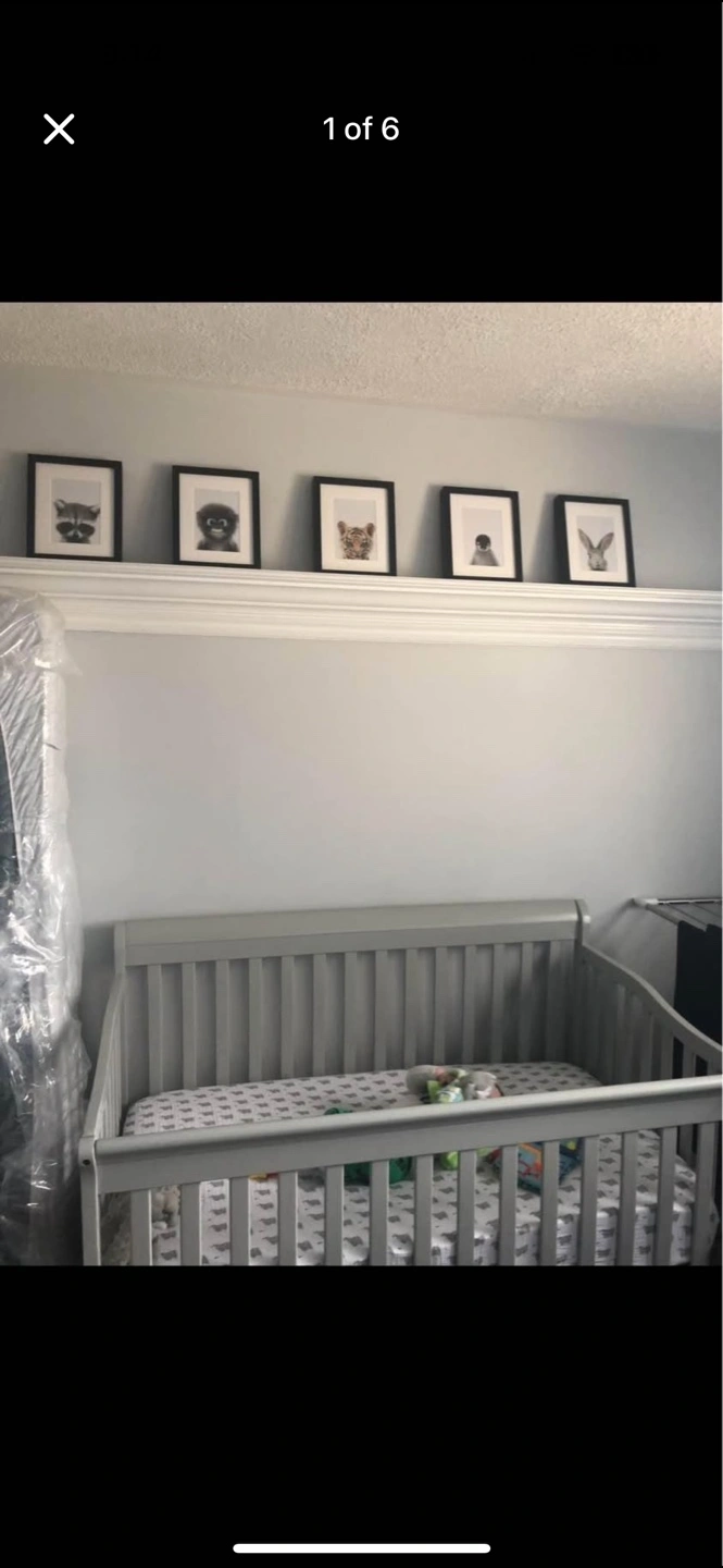 60Wooden baby crib. Available in grey, Solid wood construction. Used condition. Perfect for your little one.