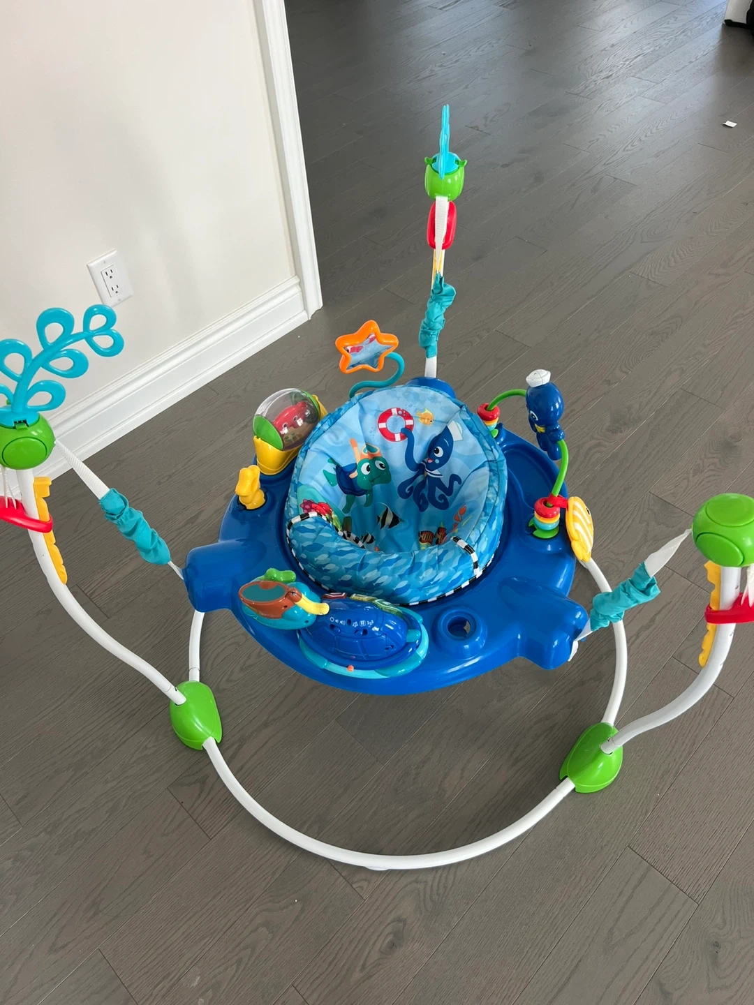 This Baby Einstein Nautical Friends jumper is perfect for keeping your little one entertained! It's in great condition and ready for a new home. The seat features fun nautical designs with turtles, octopuses, and other sea creatures. Lots of interactive toys surround the seat to keep baby engaged and happy