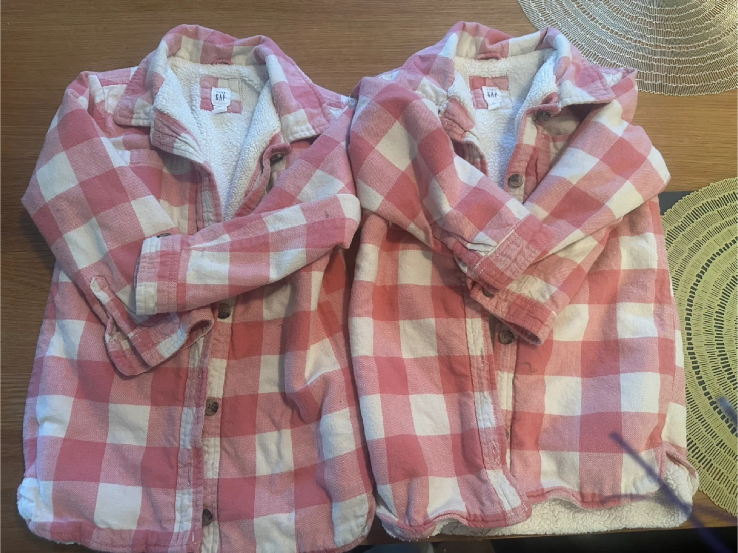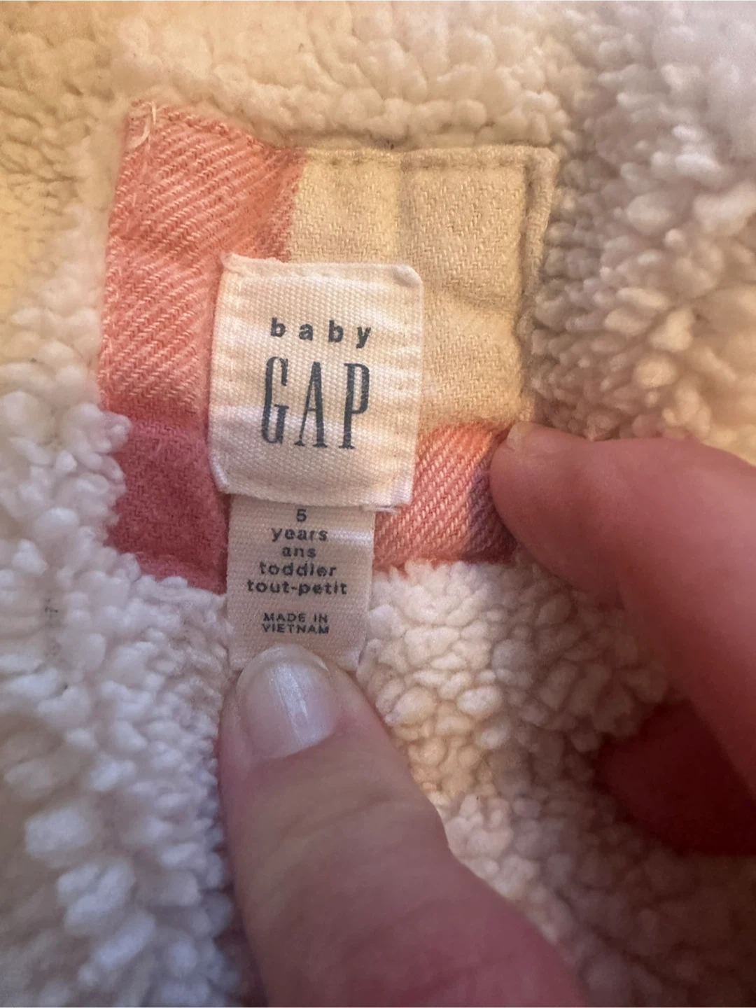 Keep your little one cozy with this adorable Baby Gap shirt jacket! It features a pink and white plaid pattern and a soft sherpa lining to keep them warm. It's in great condition and perfect for layering during cooler weather. Size 5 years.