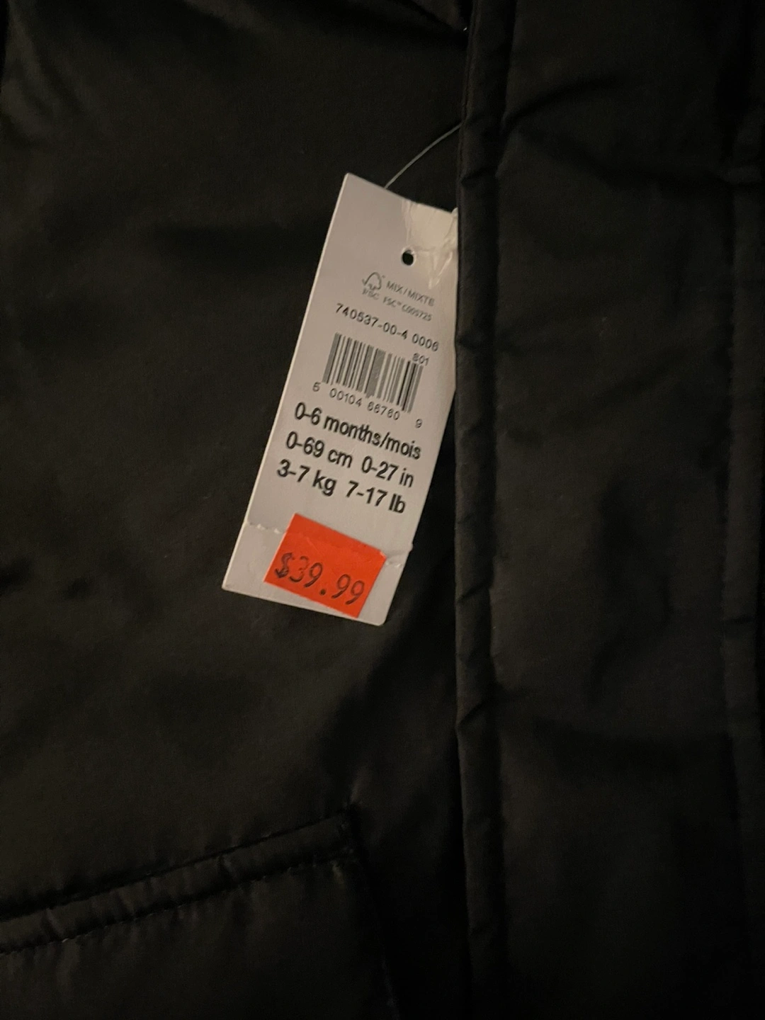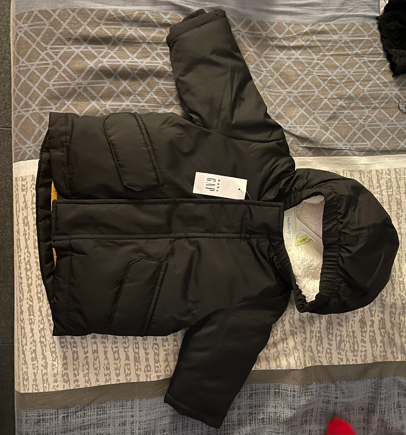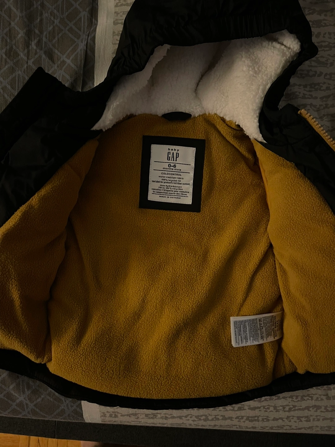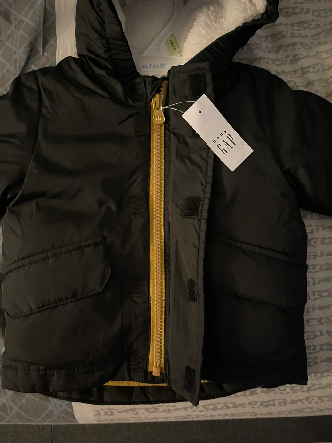 334Black puffer jacket. Size 0-6 months. Features a mustard yellow fleece lining and hood. New with tags.