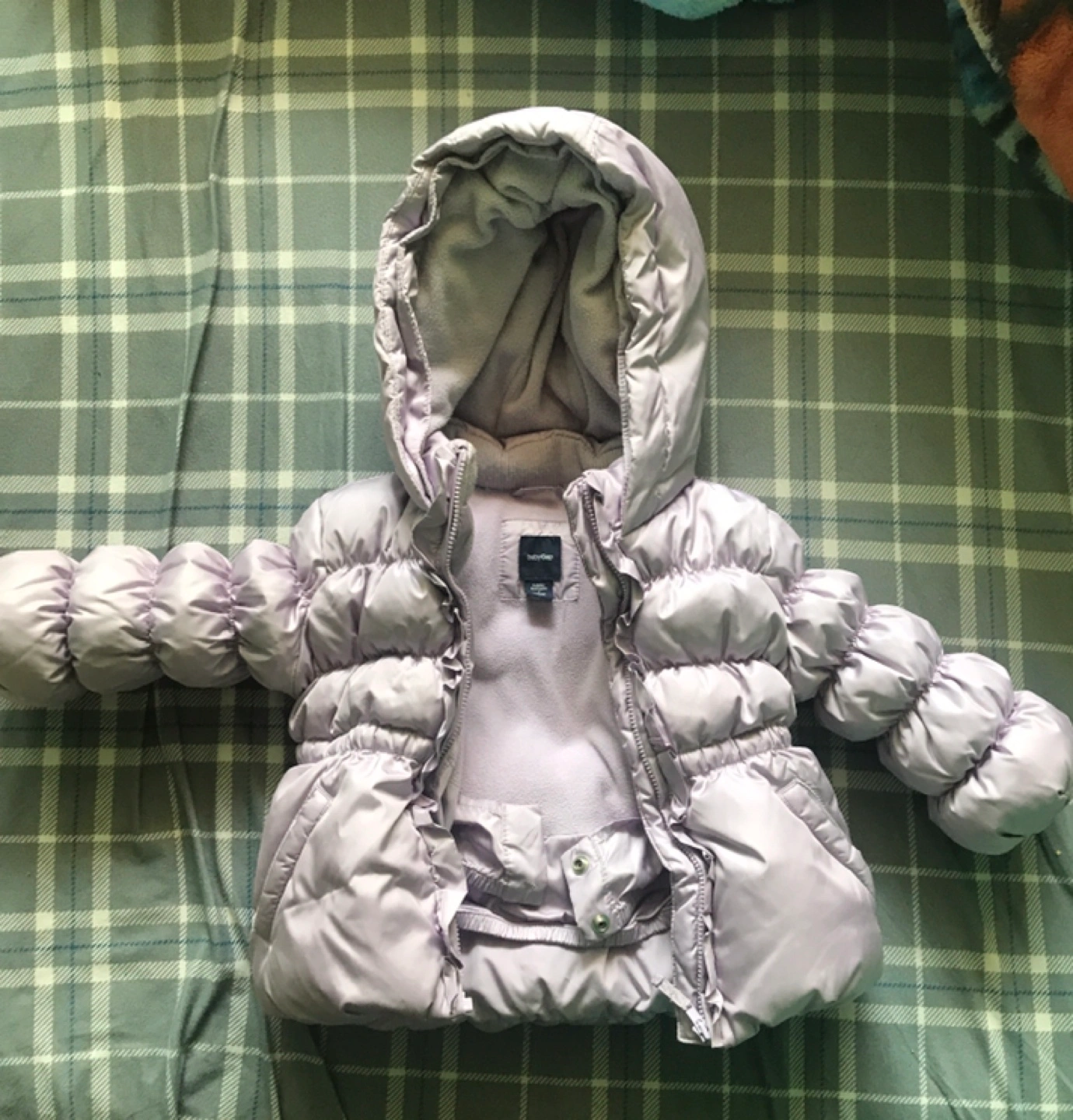 A cute and cozy puffer jacket from Baby Gap! This jacket is in a lovely lilac colour and is perfect for keeping your little one warm during the colder months. It features a soft lining and a hood for extra protection. A great addition to any baby's wardrobe! Toddler 2T.