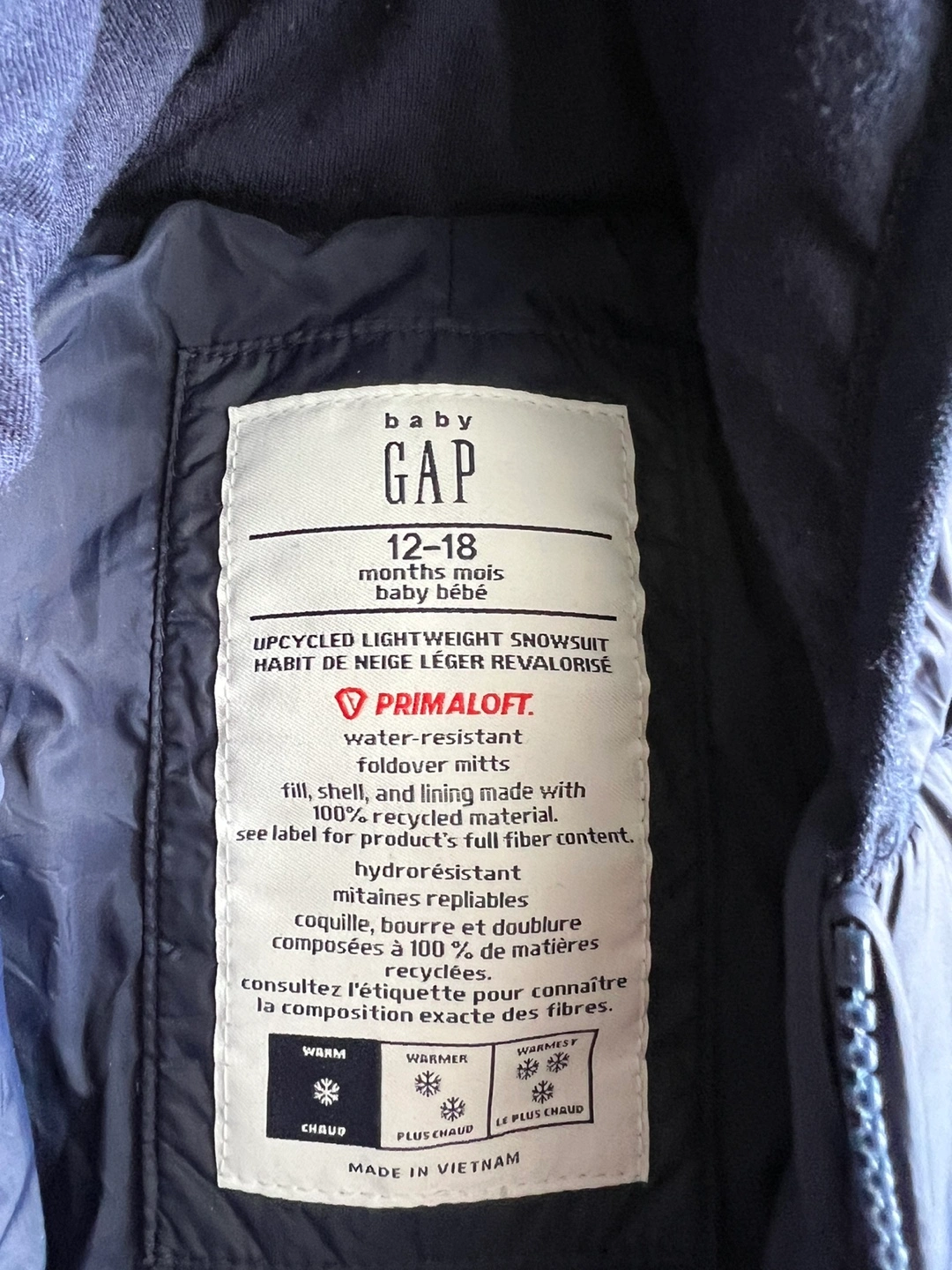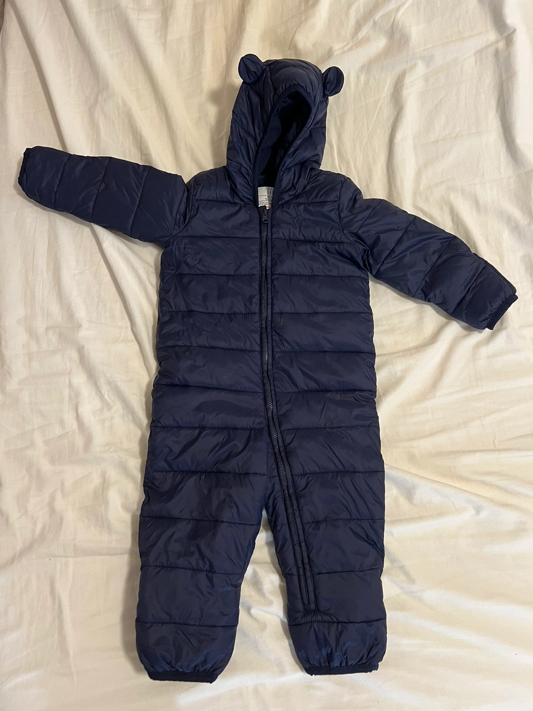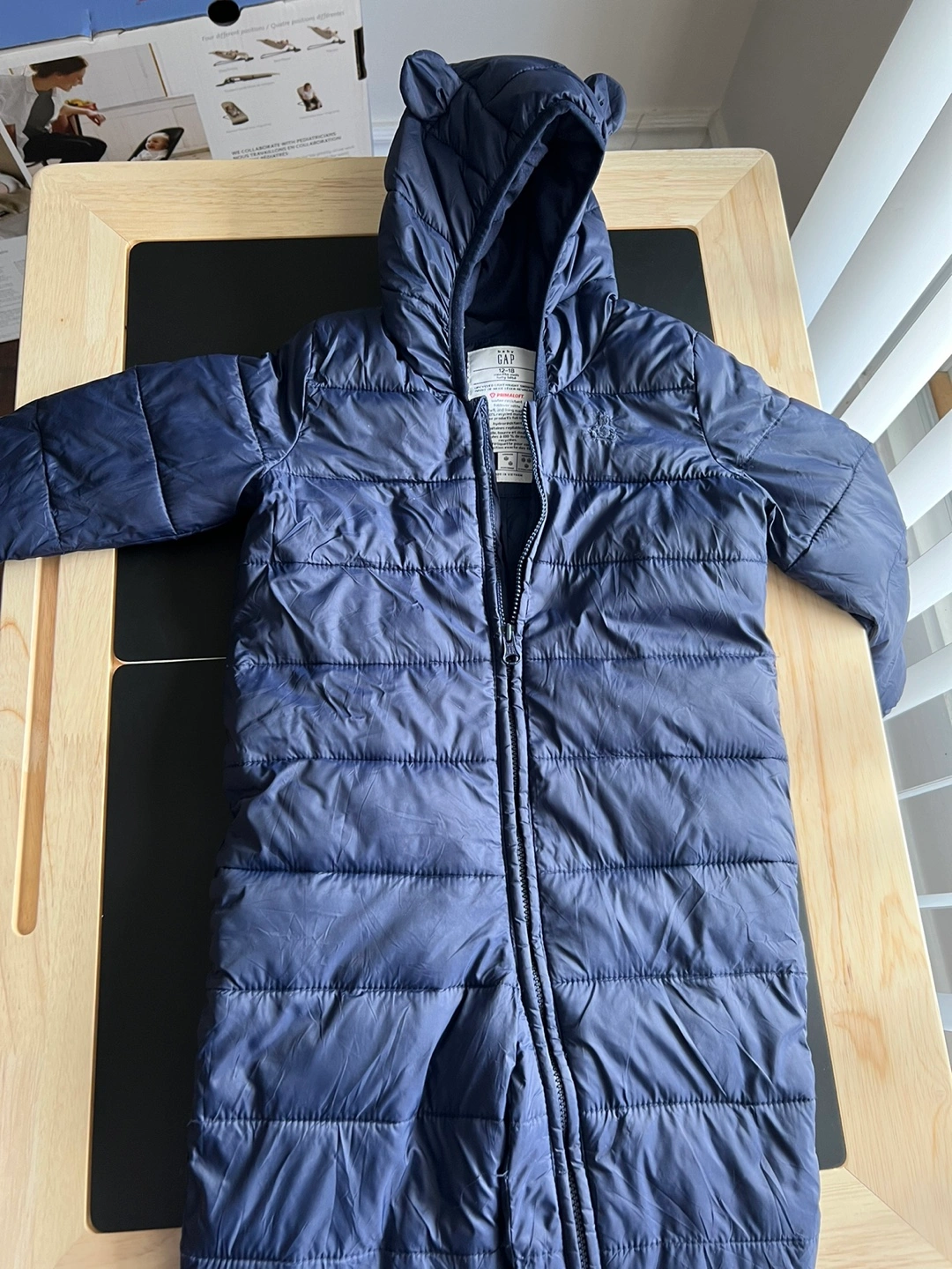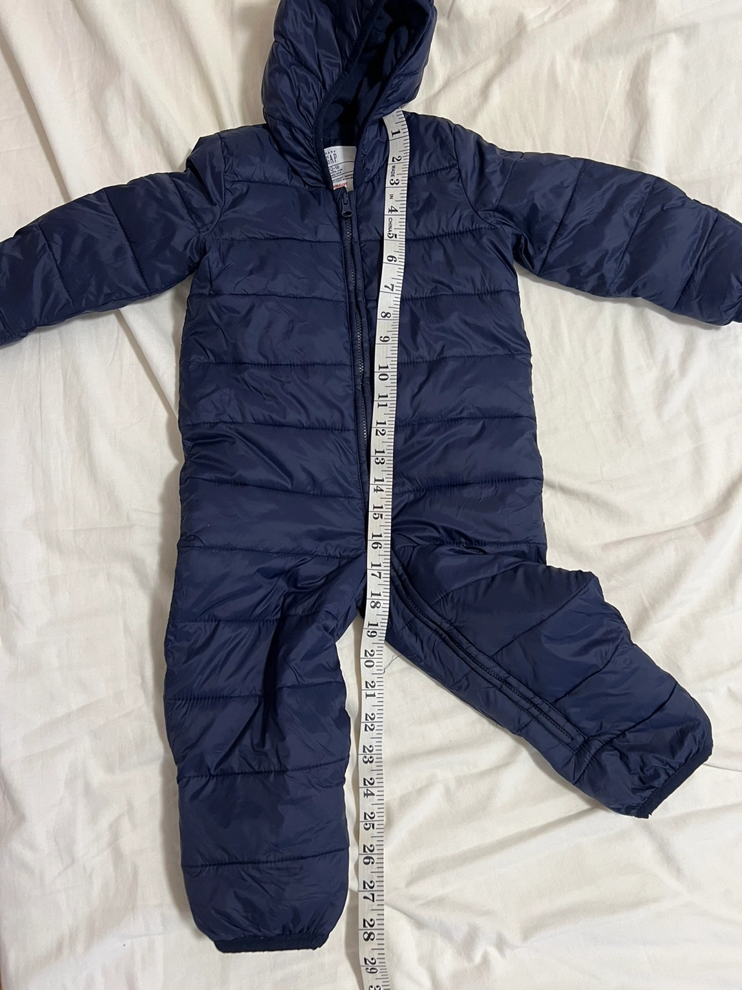 84Navy snowsuit with a hood. Flaps to fold over hands and feet but can unfold if you want to use mittens or boots. Porch pick up Leslie & Finch