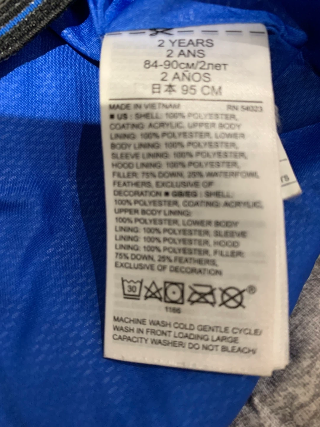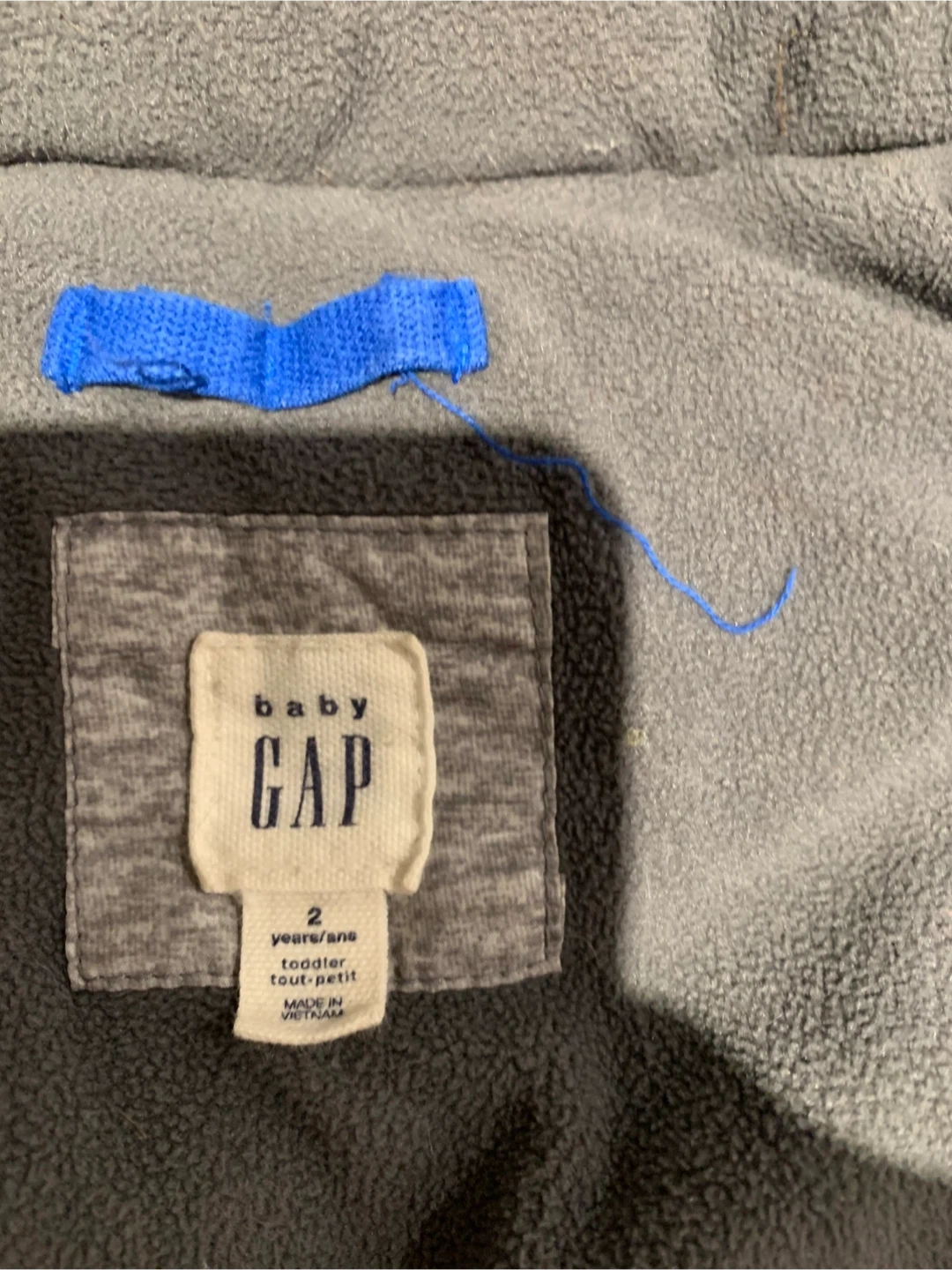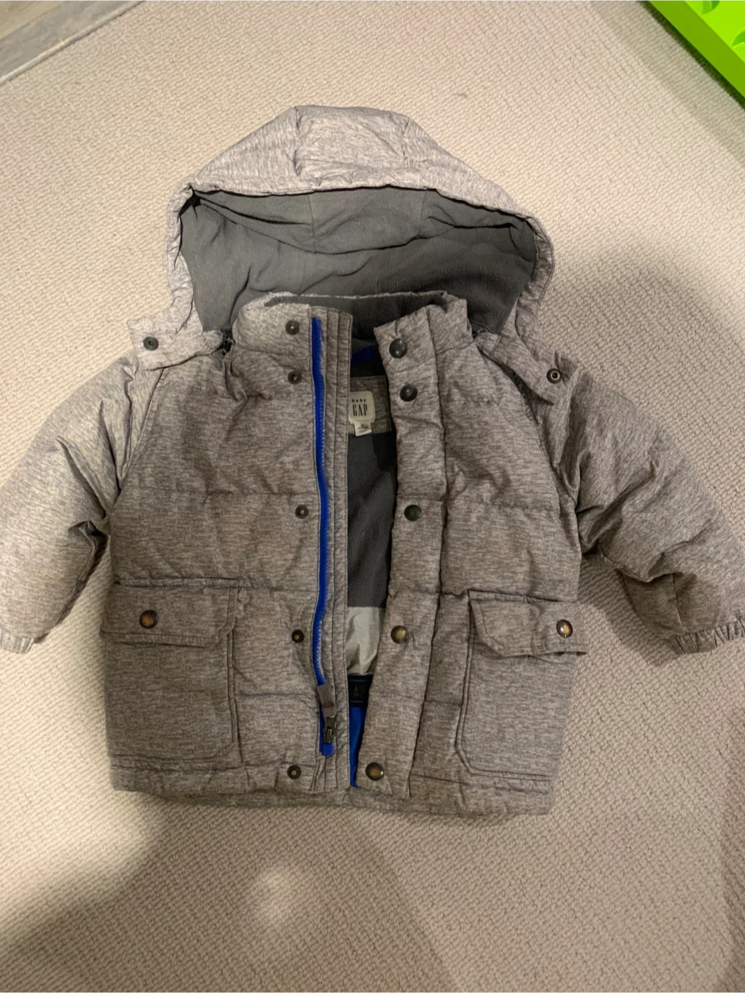 Selling a Baby Gap puffer jacket in size 2 years. It's a grey colour with a blue zipper and accents. The shell is 100% polyester, with a 75% down and 25% feather fill. Perfect for keeping your little one warm!