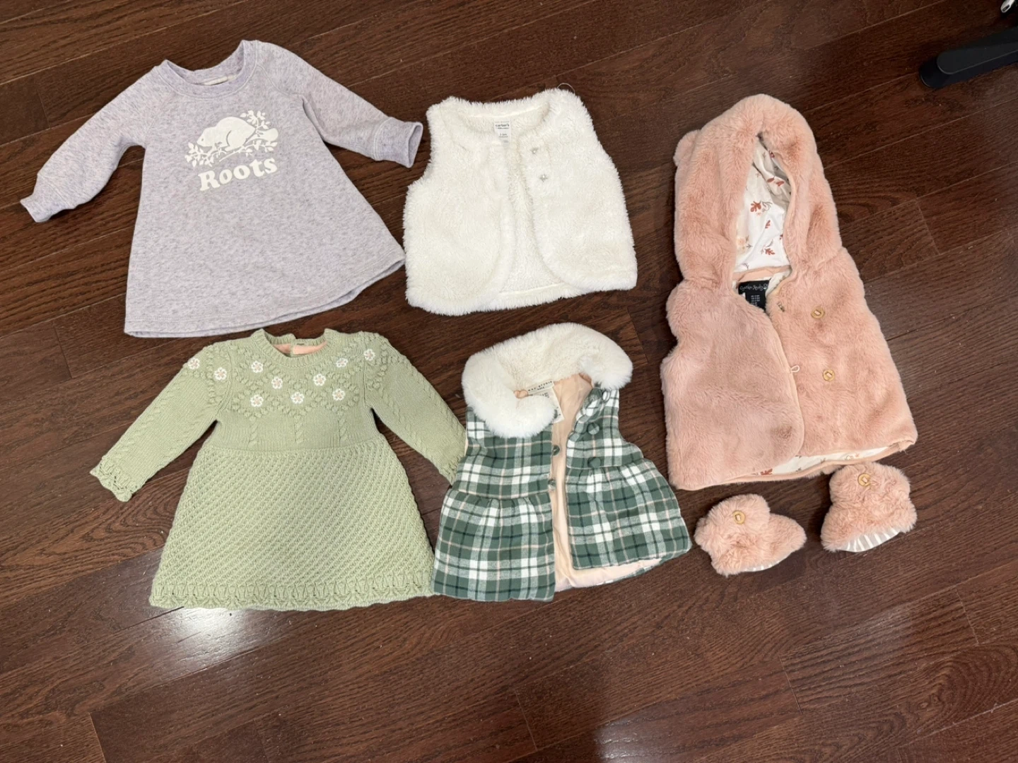 Selling a cute bundle of baby girl clothes, size 3-6 months! Includes: - Roots dress - Carter's white vest - Pink faux fur vest with bear ears - Green knit dress - Plaid vest with faux fur collar All in great condition and ready for a new home
