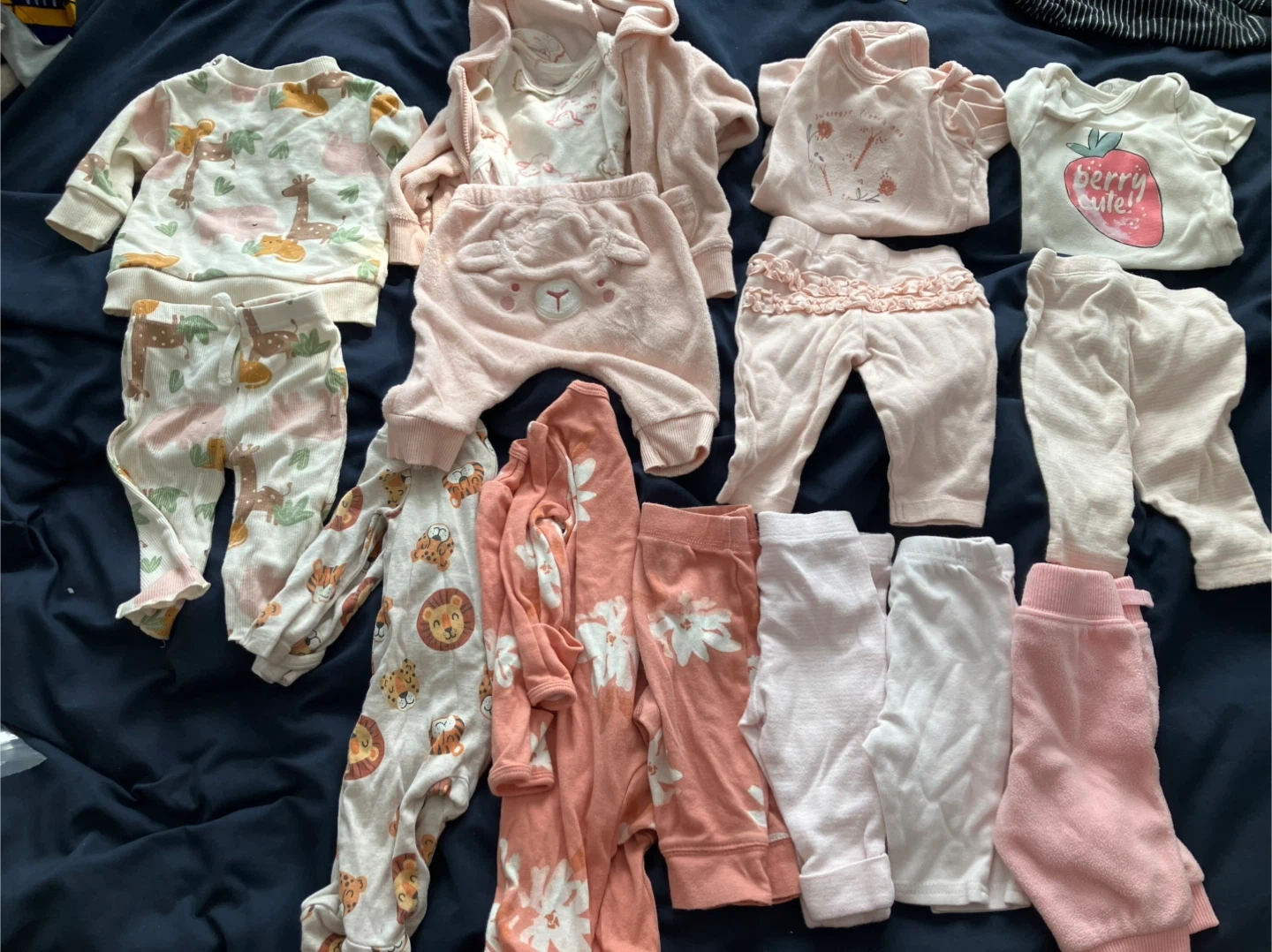 A sweet bundle of baby girl clothes in size 0-3 months! Includes a variety of tops, bottoms, and a cute hoodie. All in gentle, excellent pre-loved condition and ready for a new little one