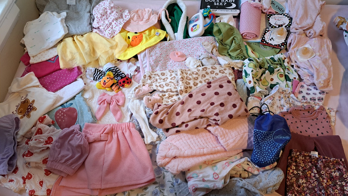 44 items everything for 45$ baby girl 3-6 months bundle includes Pj's, onesies, pants, shirts, dresses, hats, one Halo sleepsack, socks, baby books. pet free smoke free home pick up location St clair and Dufferin intersection.