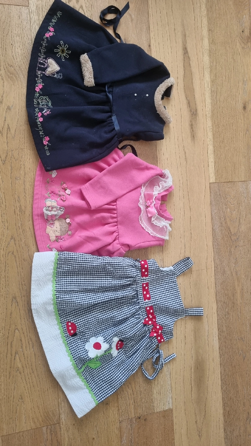 Three adorable baby dresses! - One is a navy blue dress with a soft, furry trim and embroidered details. - Sweet pink dress with a lace collar and a charming thread work - Gingham patterned dress with ladybug and flower embellishments