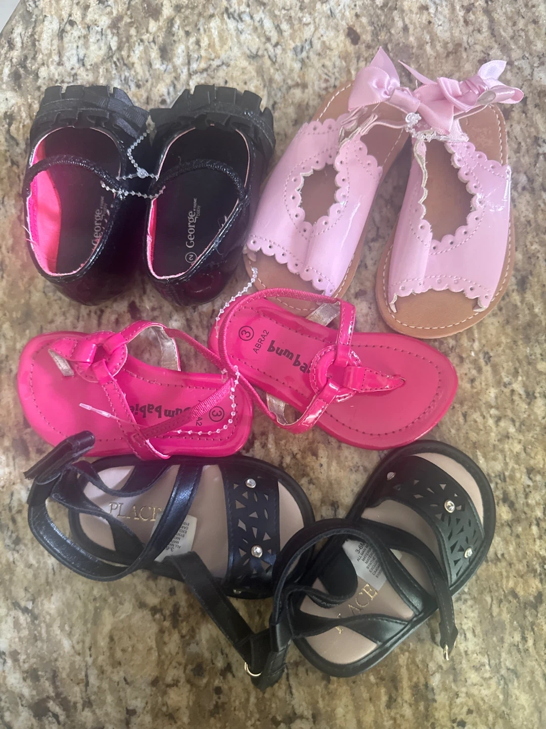 Selling a cute bundle of baby girl shoes! Includes: - George black Mary Janes, size 2 - Bumba pink sandals, size 3 - Place black sandals, size 3-6M