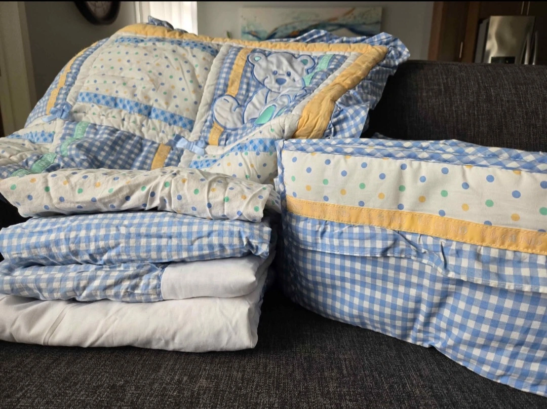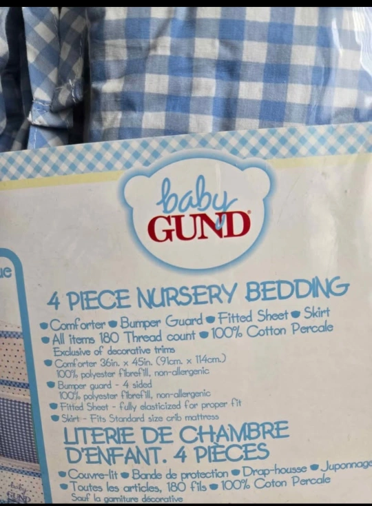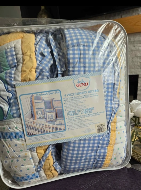 Selling a Baby Gund 4-piece nursery bedding set in the Patchwork Bear Blue design! This adorable set includes: - Comforter - Bumper guard - Fitted sheet x2 - Skirt x2 All items are made with 180 thread count 100% Cotton Percale and polyester fibre fill. The comforter measures 36in x 45in (91cm x 114cm) and the skirt fits a standard size crib mattress. Originally bought for $129.99! 1 fitted sheet has little stain but not noticeable