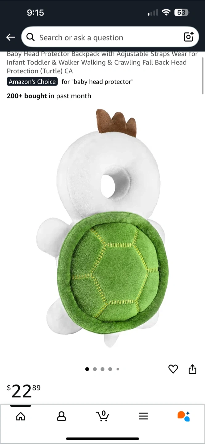 1000+Keep your little one safe while they explore with this adorable turtle-design head protector backpack! It features adjustable straps for a comfortable fit and provides cushioning to protect their head during falls while walking or crawling. Originally bought for $22.89! Personally purchased for my son. He used it once (see photo) however did not like it. It has been sitting around for a few months unused and he walks unassisted now so no longer of use for me . Brand new condition there is no wear or tear