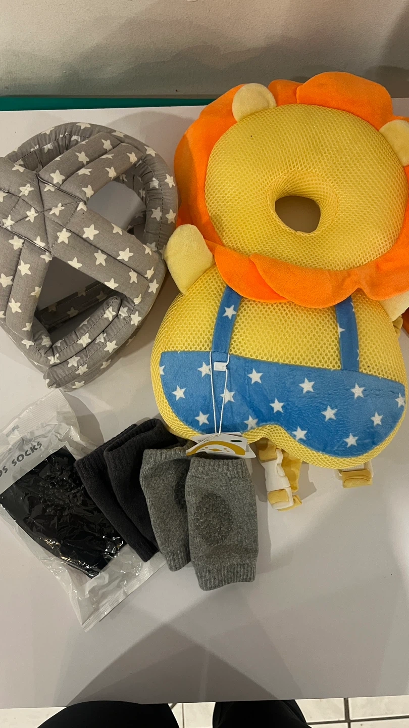 10Selling a baby head protector and knee pads set. The head protector is designed to prevent injuries. The knee pads are gray and black, and the head protector has a star pattern