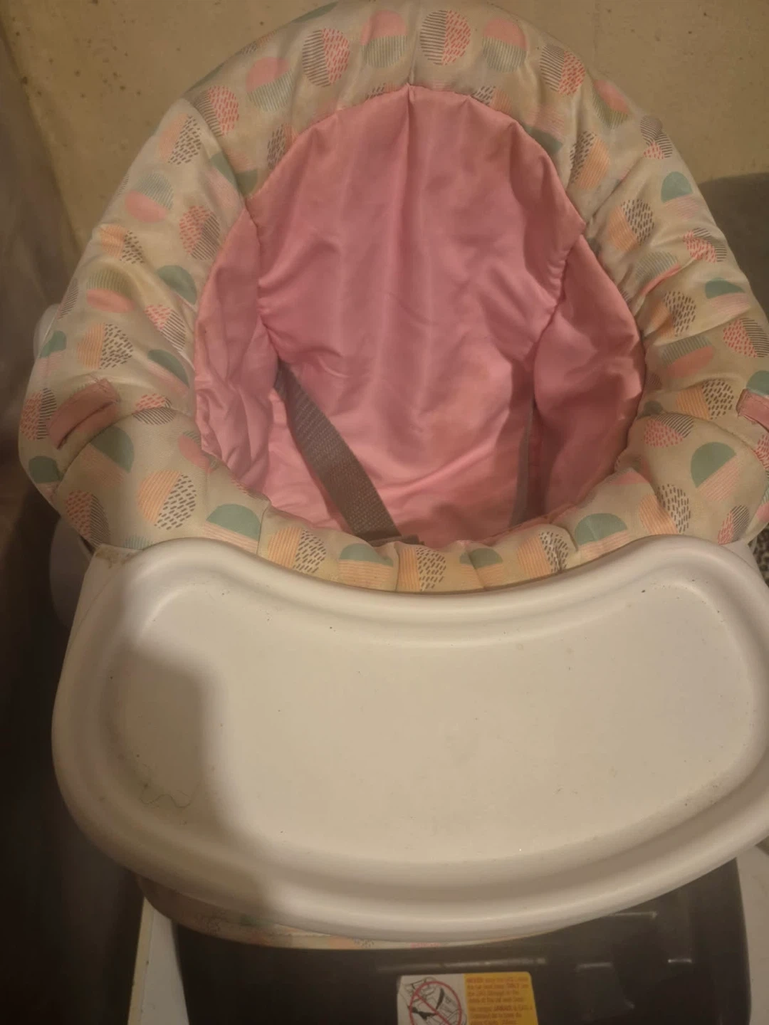 60Selling a used baby high chair. It has a white tray and a pink and patterned seat cushion. Good for feeding time! Brought for 85