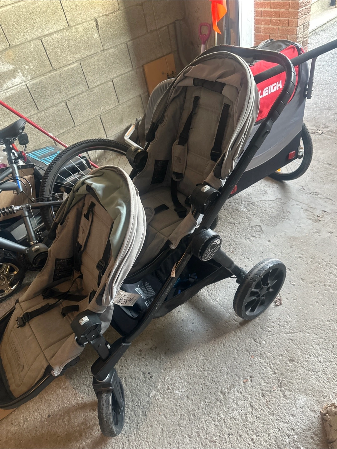 76Double stroller, grey fabric. Good used condition. Includes two seats.
