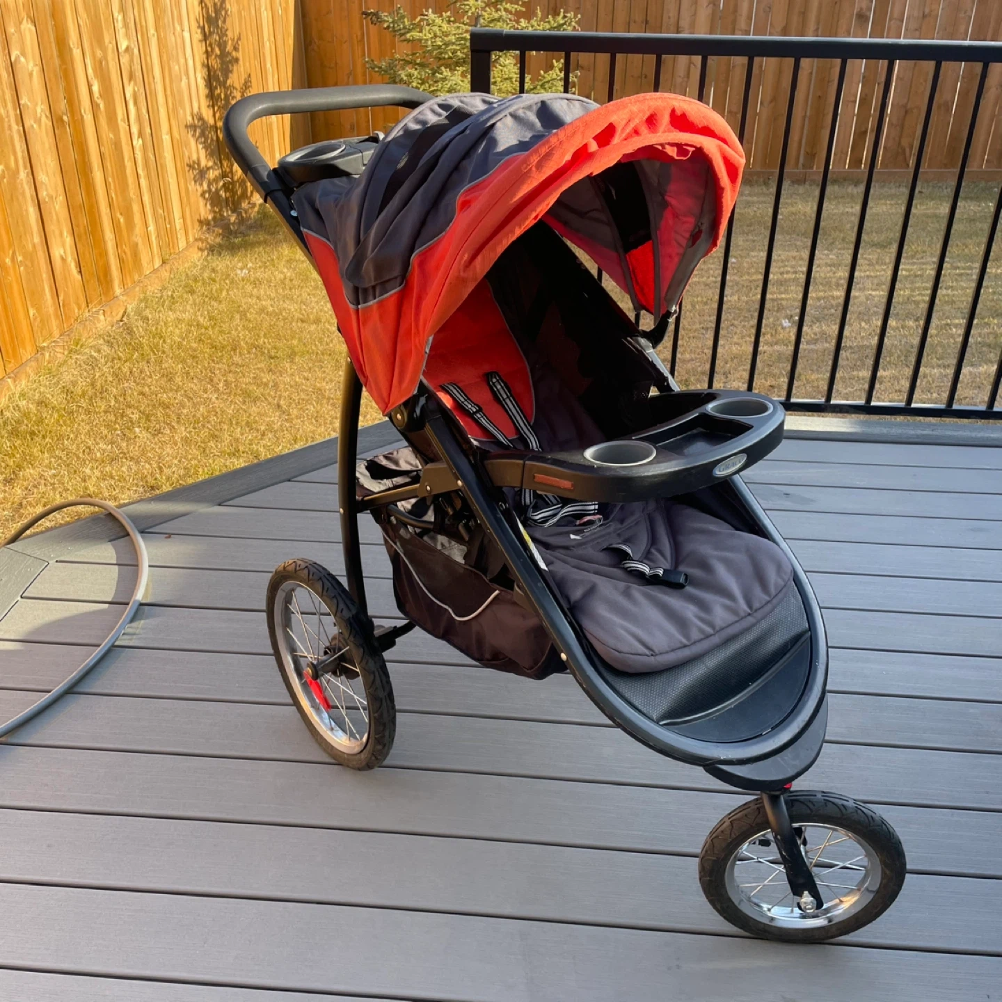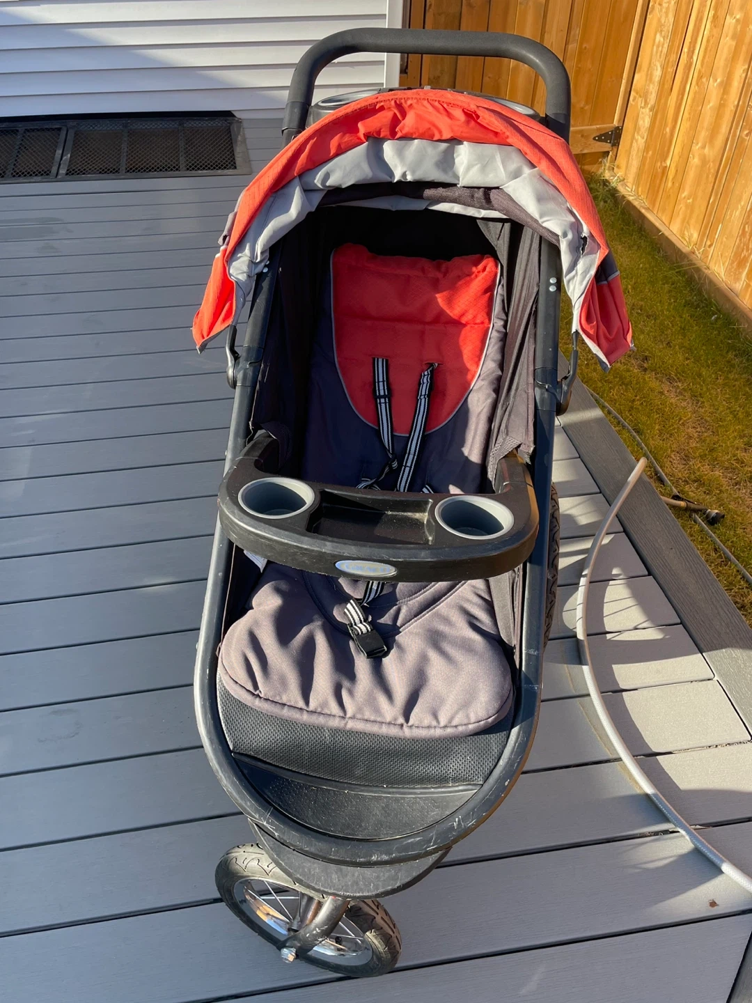 149Graco Jogging Stroller - Red & Black. It’s In Good Condition Some Wear, Has A Convenient Parent Tray with Cup Holders, Storage Basket Underneath. Cash & Pick Up Only Can’t Deliver. First Come First Serve No Holds.