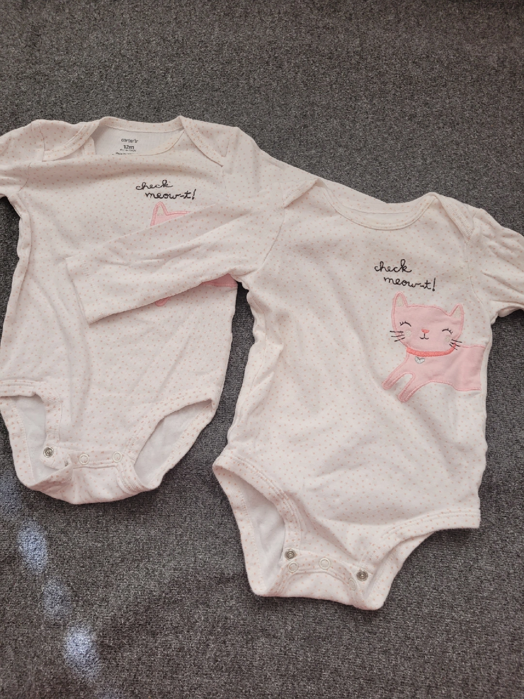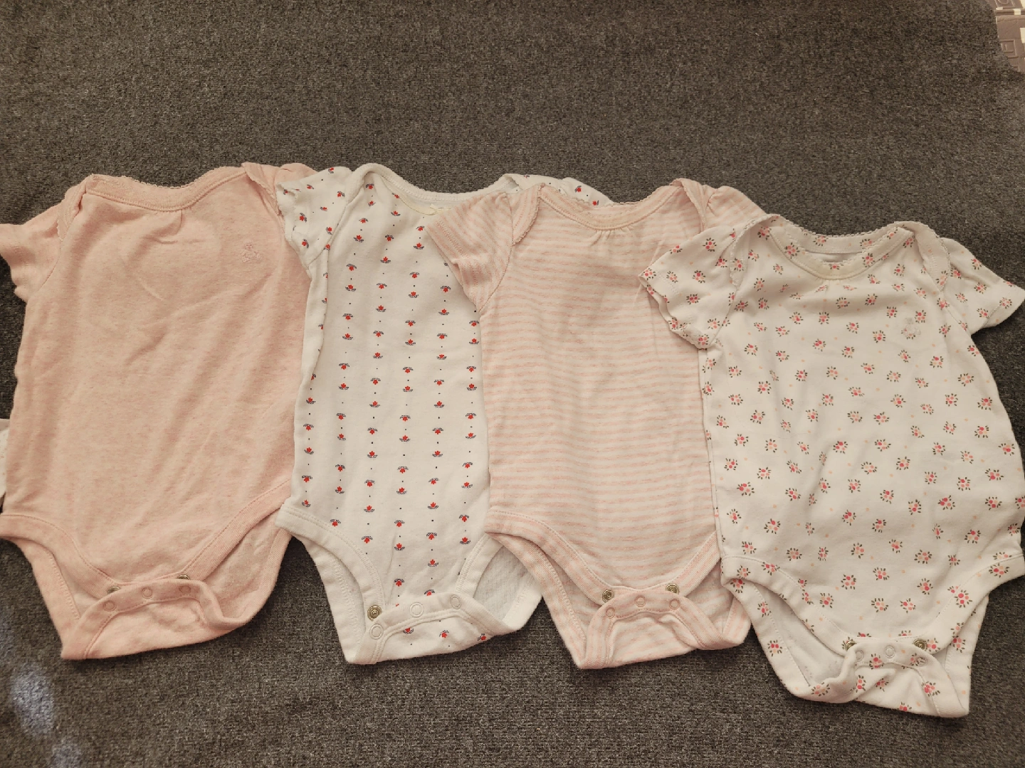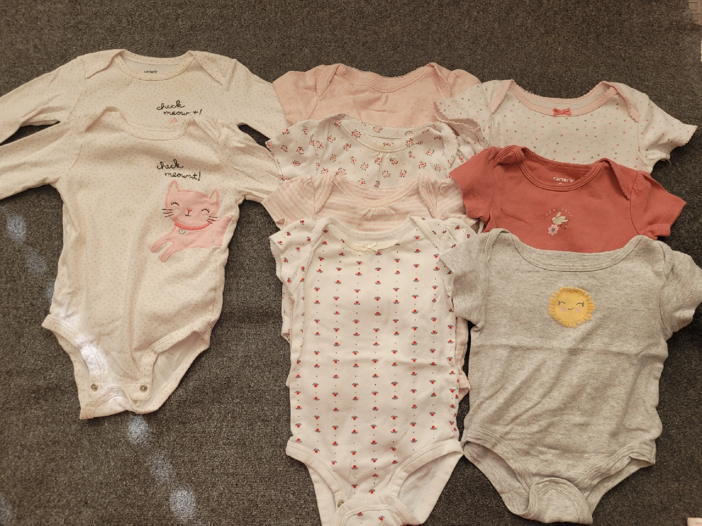 A cute bundle of baby onesies in excellent condition! Includes brands like Carter's, Gap, Just Born, and Child of Mine. Sizes range from 3-12 months. Perfect for your little one! $10 for all good condition
