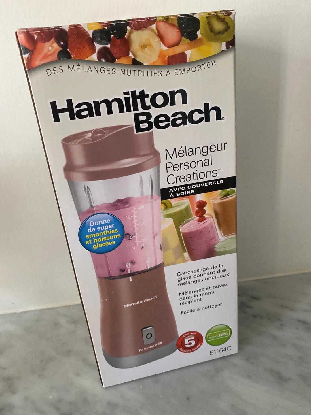 I'm selling a Hamilton Beach Personal Creations Blender! It's perfect for making smoothies and icy drinks. It comes with a lid for easy drinking. The original price was $26.98. It's easy to clean and a convenient size for on-the-go use