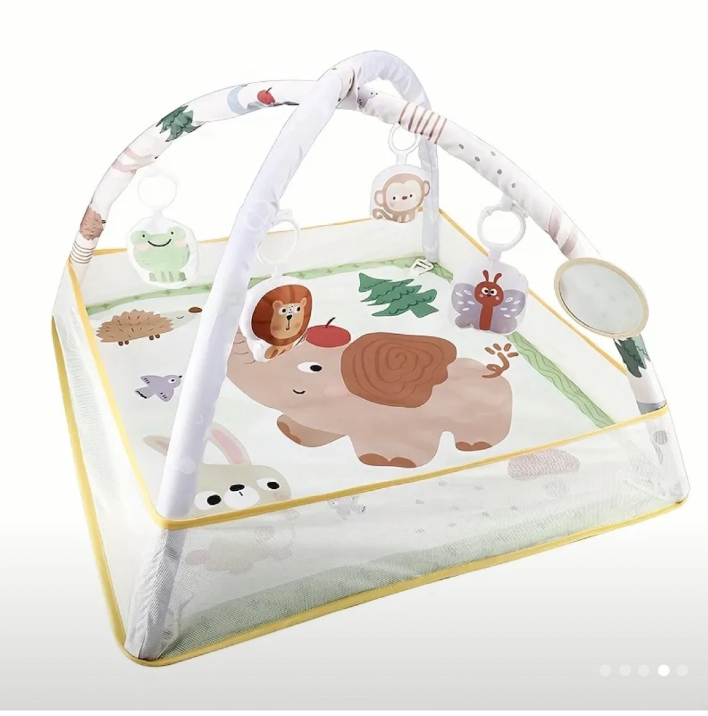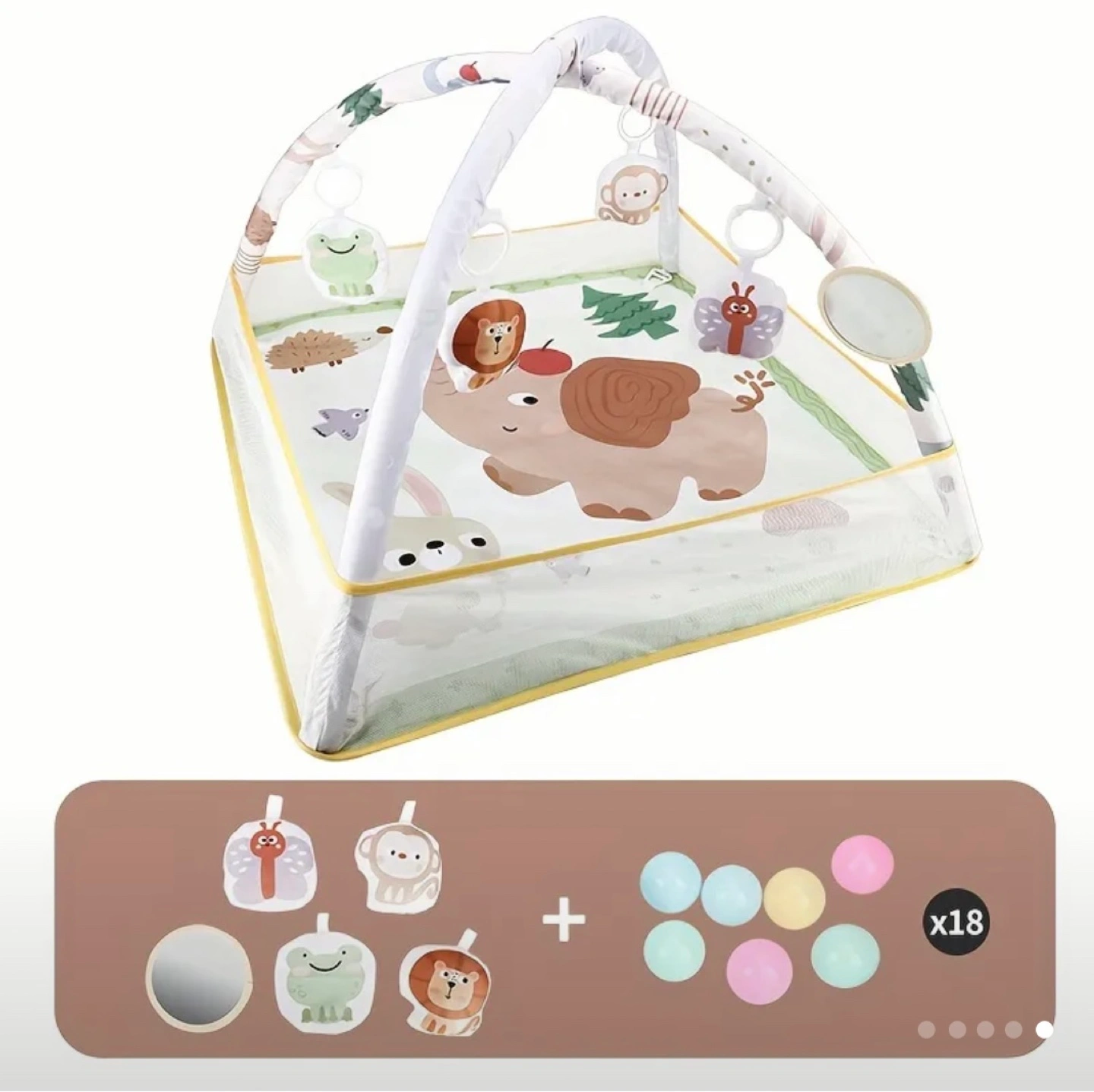 Play mat with arch and hanging toys. Includes 18 balls. In good condition.