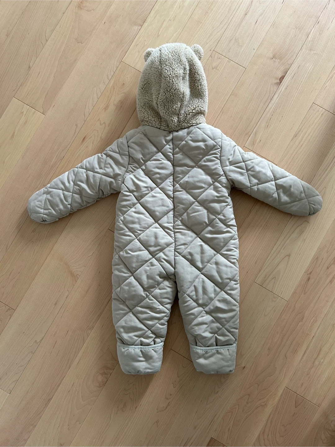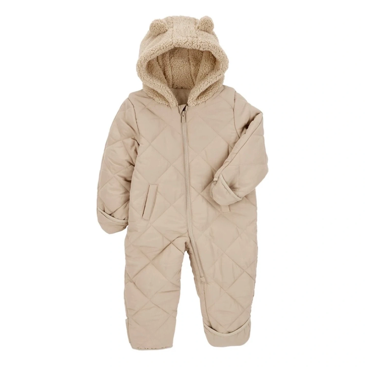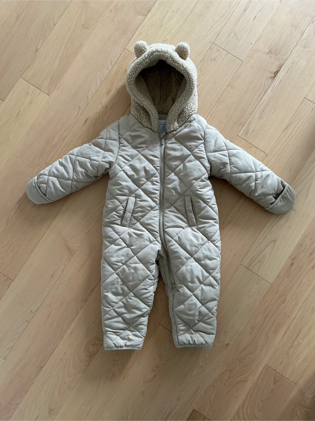 Carter’s quilted zip-up snowsuit in beige/tan colour, featuring a cozy sherpa hood with super cute bear ears on top, and poly-lined body and sleeves. Have the option to flip sleeve and leg openings depending on whether or not your child wears separate mittens or boots. Size: 18 months Content: 100% polyester (machine washable) Condition: Excellent used condition (for one winter season at daycare). There is normal wear/pilling on the mitt and leg opening elastic hems. The rest of the body is like new.