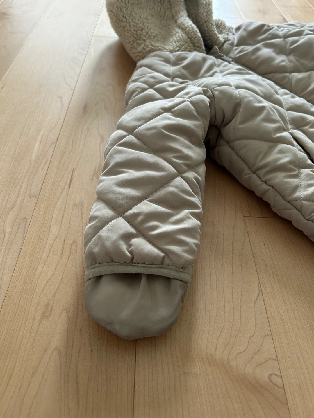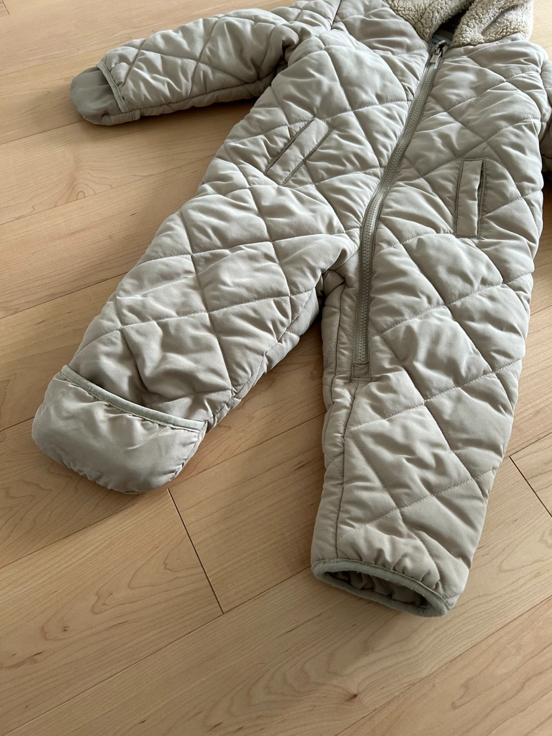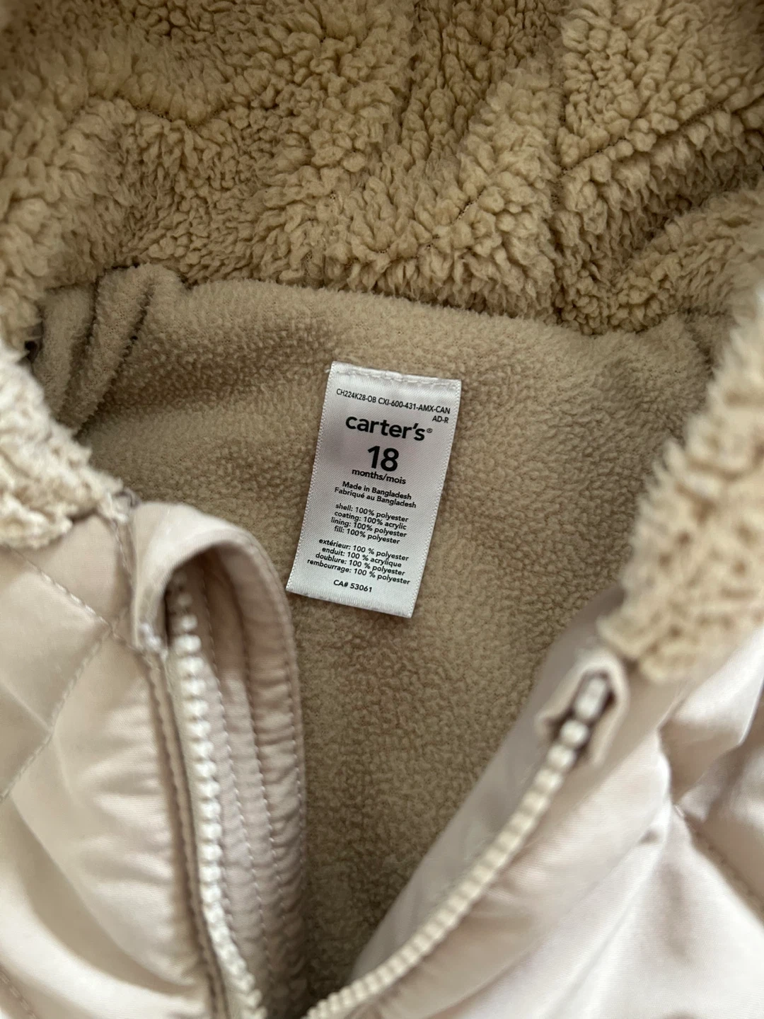 Carter’s quilted zip-up snowsuit in beige/tan colour, featuring a cozy sherpa hood with super cute bear ears on top, and poly-lined body and sleeves. Have the option to flip sleeve and leg openings depending on whether or not your child wears separate mittens or boots. Size: 18 months Content: 100% polyester (machine washable) Condition: Excellent used condition (for one winter season at daycare). There is normal wear/pilling on the mitt and leg opening elastic hems. The rest of the body is like new.