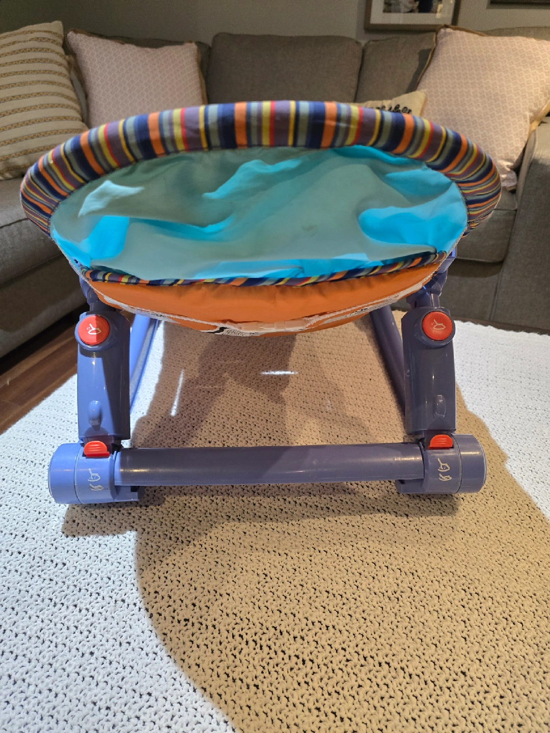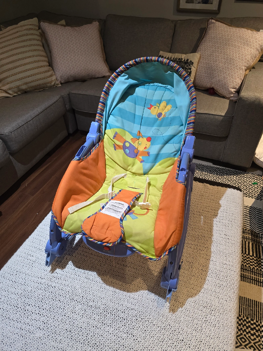 Selling an adjustable baby rocker/stand seat with safety harness. It's in great condition and ready for a new home! Perfect for keeping your little one entertained and comfortable while parents are busy. The seat vibrates to soothe a baby or toddler.