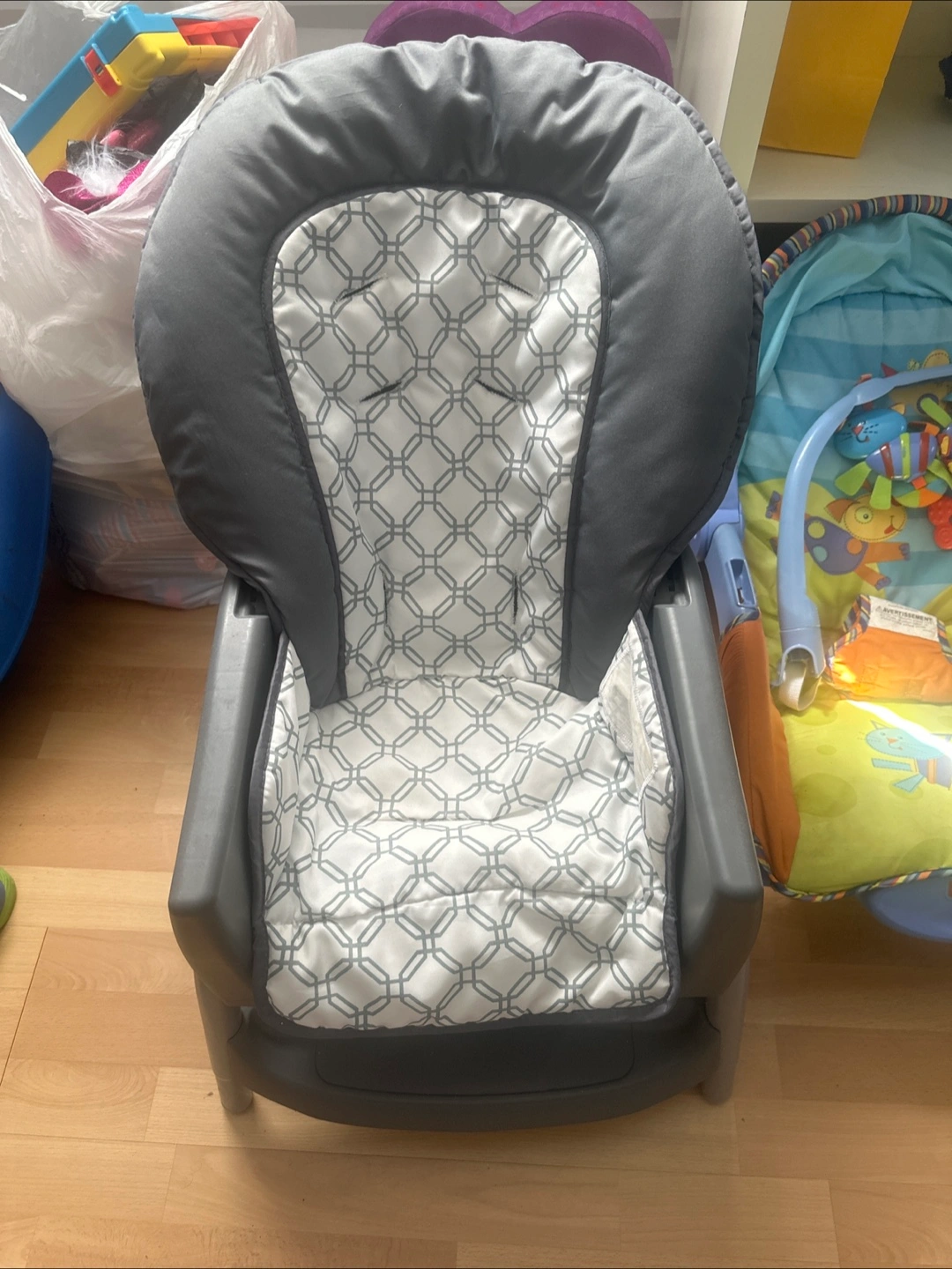 76Baby seat with a padded seat. The seat has a gray and white pattern. It is made of plastic and seems sturdy. This chair will provide a comfortable spot for a baby to sit and relax.