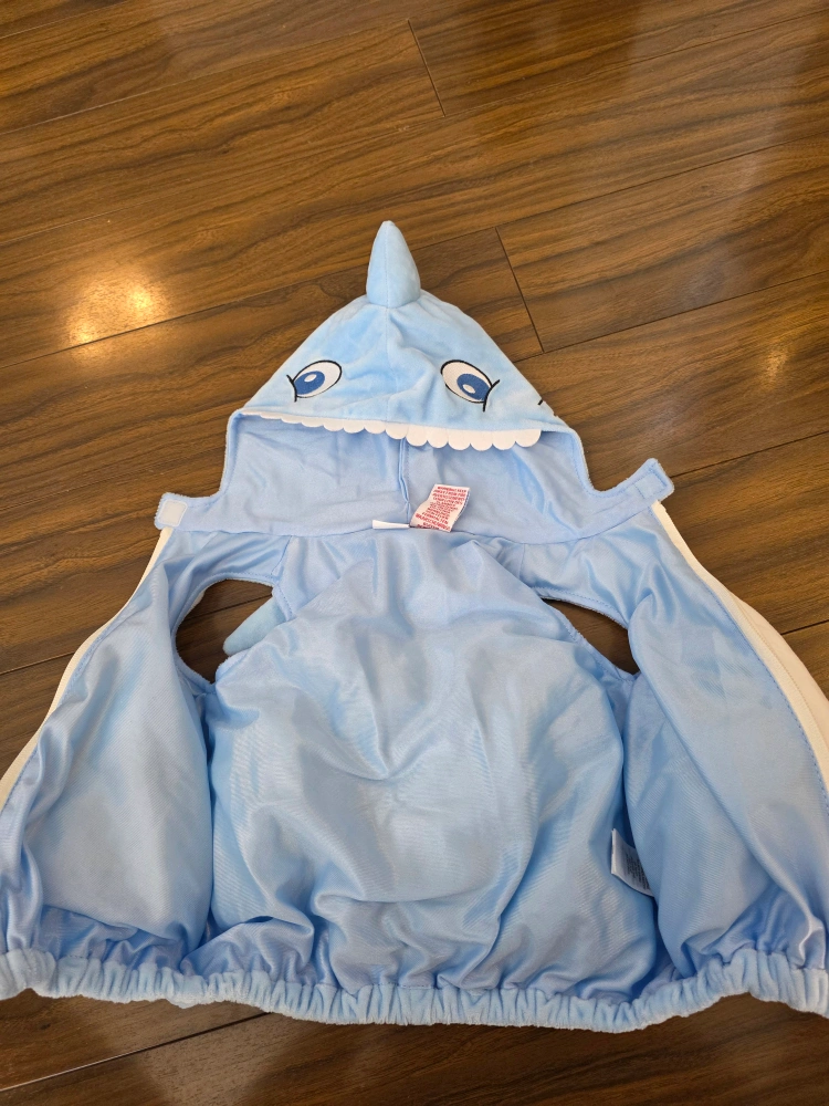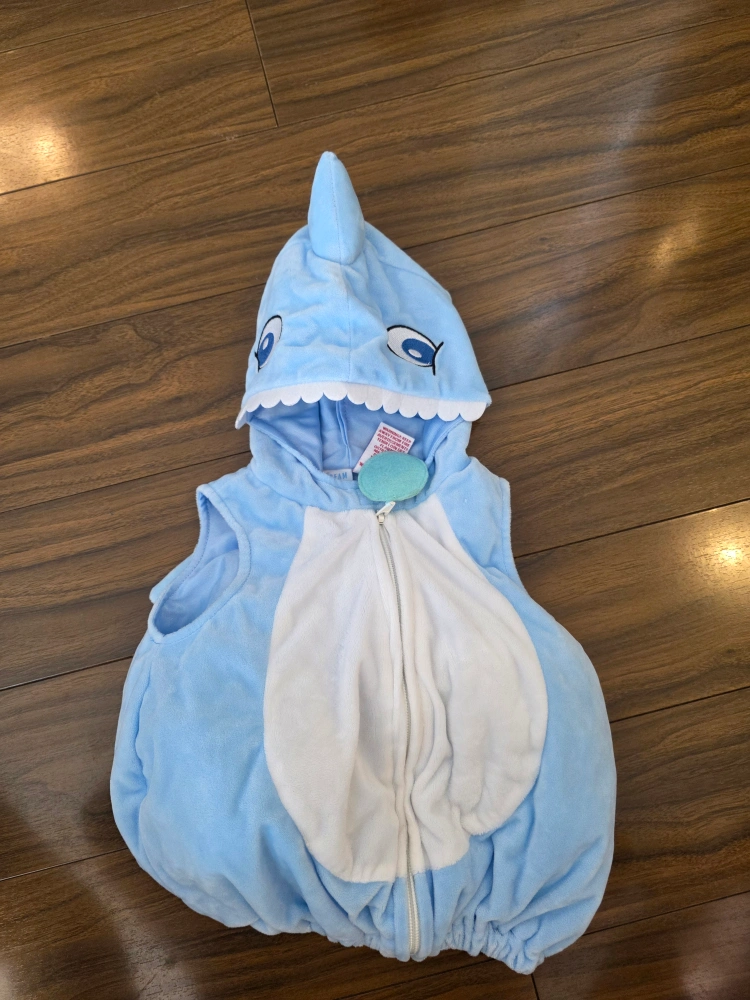 A cute and cozy light blue shark costume for your little one! Perfect for dress-up or Halloween. It's in great condition and ready for a new home