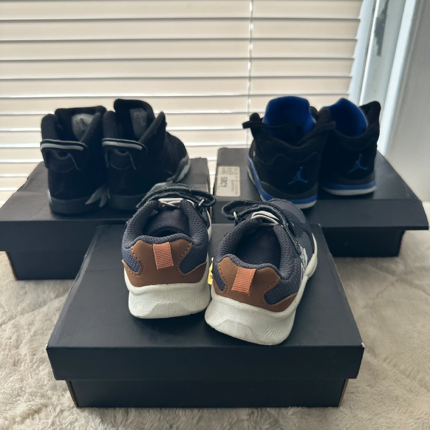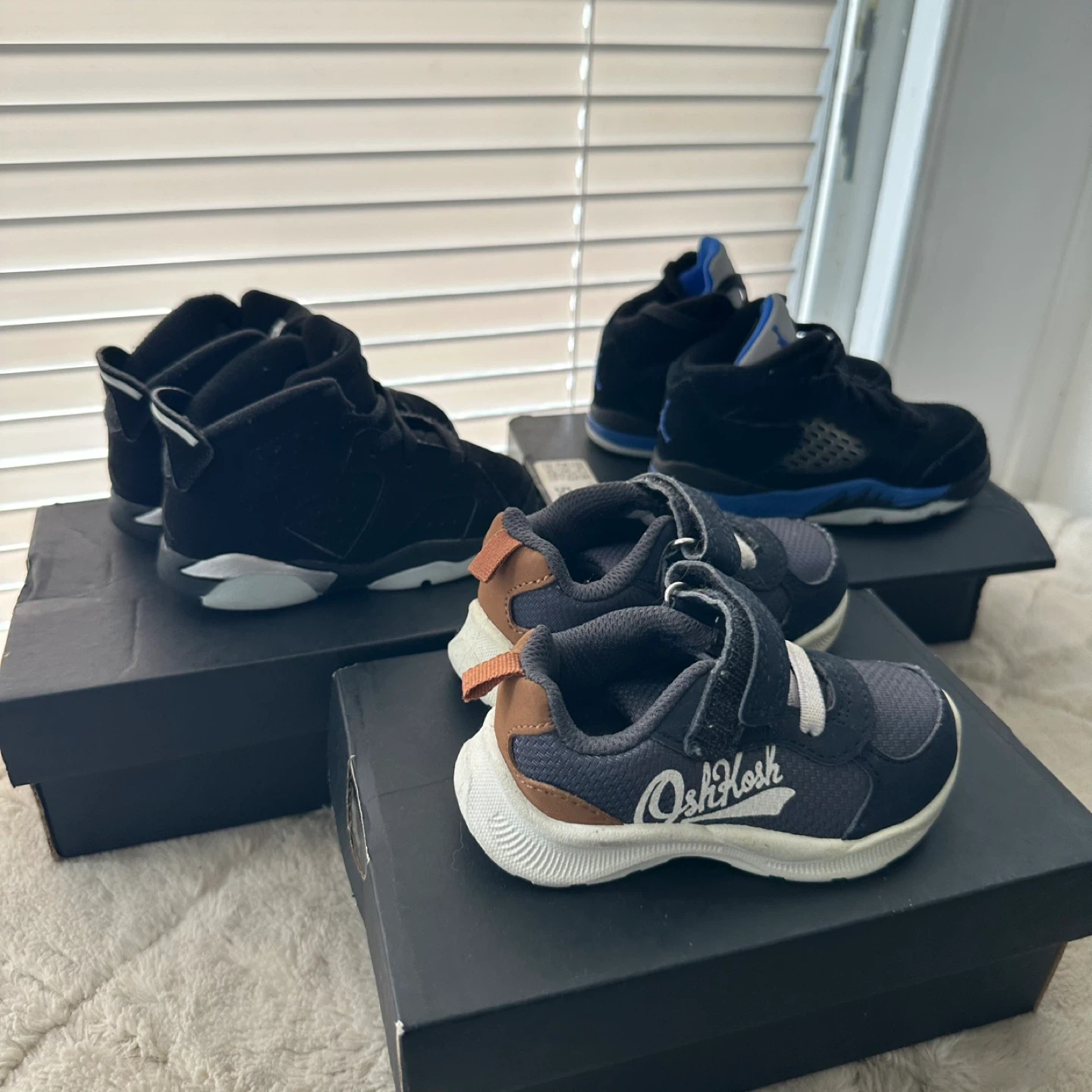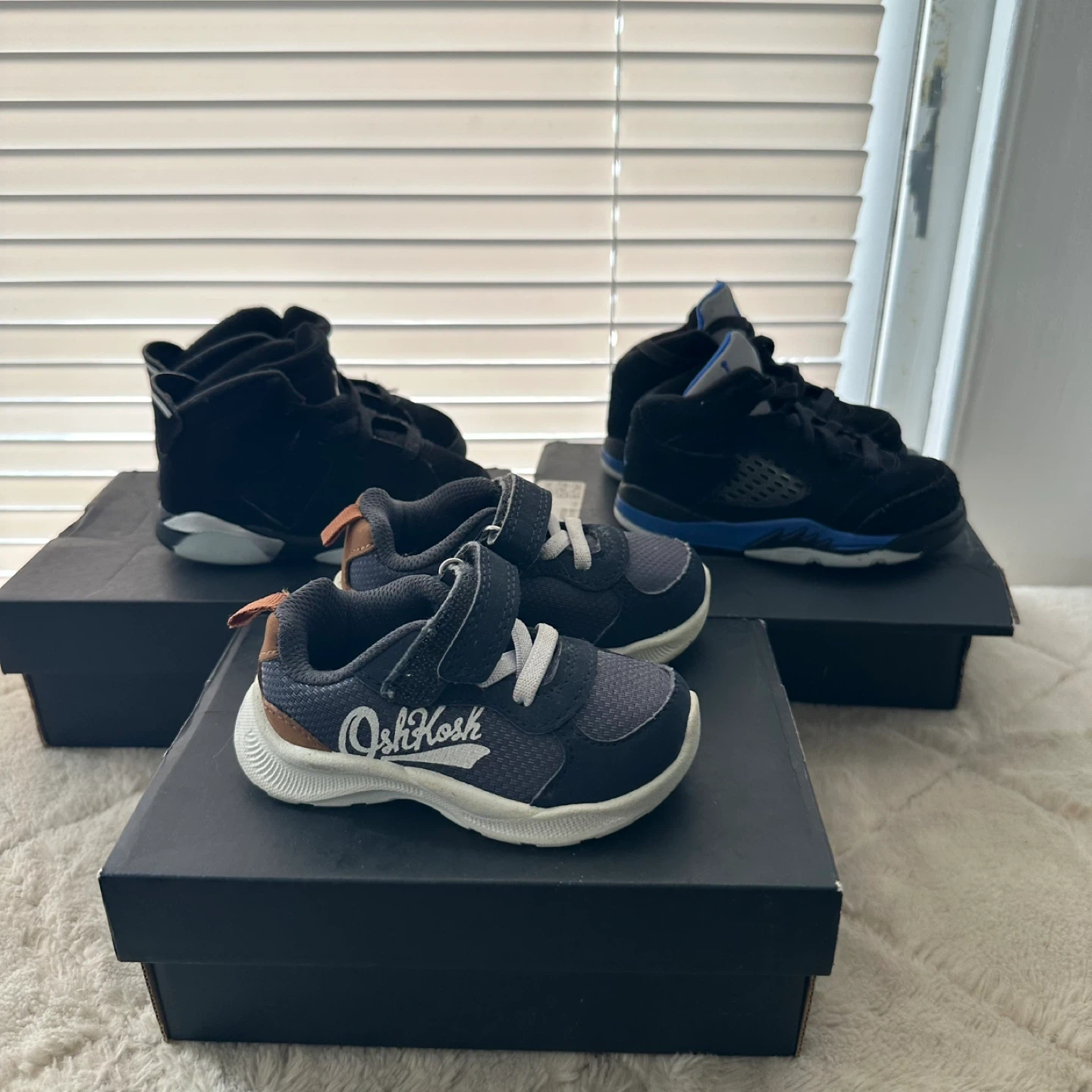 75Selling a set of baby shoes, including Air Jordans and OshKosh B'gosh sneakers! They come with their original boxes. Perfect for your little one!