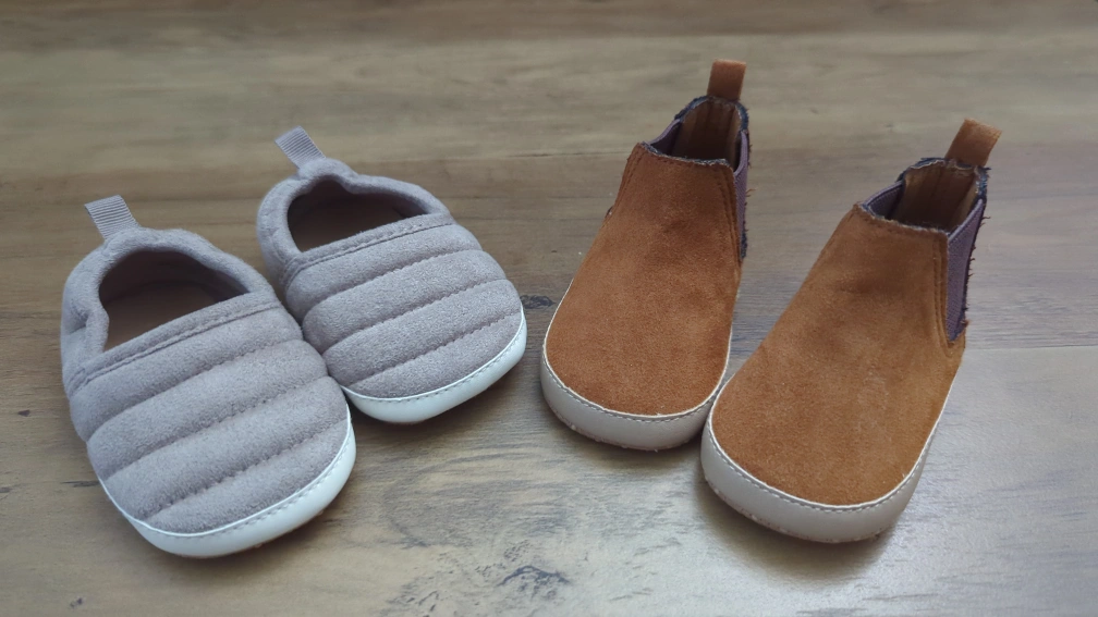 Two pairs of baby shoes up for grabs! One pair is a (0-3months)stylish brown Chelsea boot style, and the other is a comfy-looking grey slipper(3-6months). Both are in great shape and ready for a new little owner.