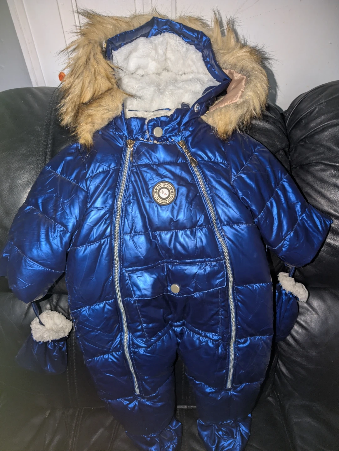 9/12 months, Keep your little one warm this winter with this adorable blue snowsuit! It features a cozy fur-trimmed hood and attached mittens to keep your baby snug and protected from the cold.