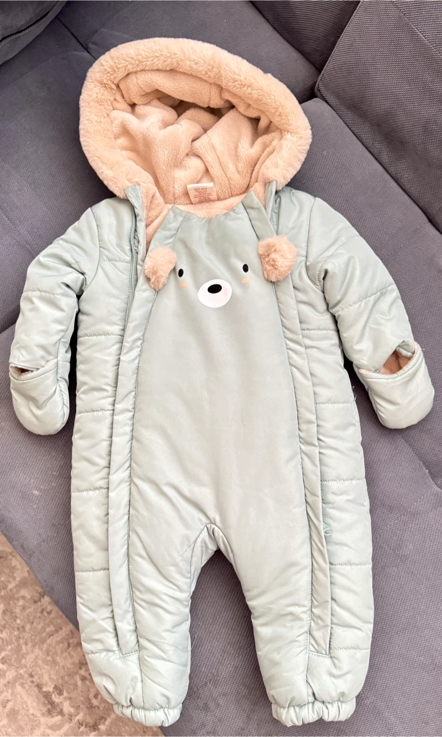 66A super cute baby snowsuit, perfect for keeping your little one warm this winter! It features an adorable bear design on the front and a cozy, lined hood. The colour is a lovely light blue, great for any baby!