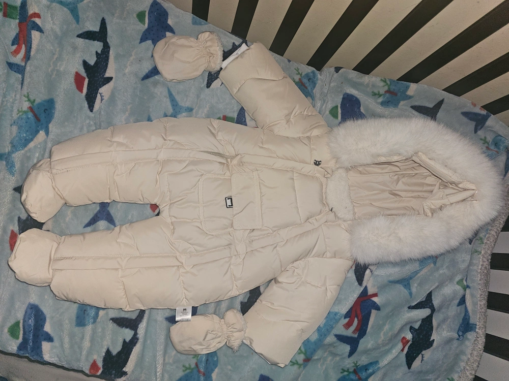 Here's a cozy baby snowsuit to keep your little one warm this winter! It comes with matching mittens to protect those tiny hands from the cold. Perfect for outdoor adventures or just a stroll in the park