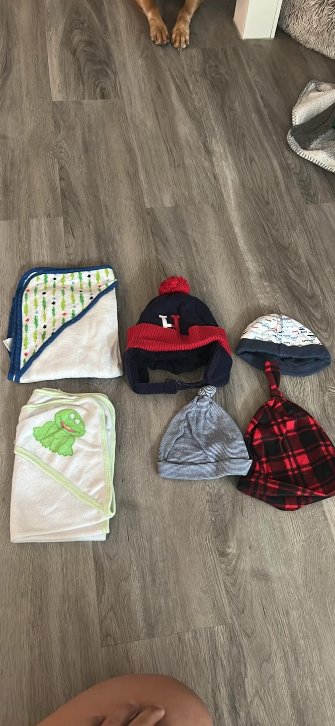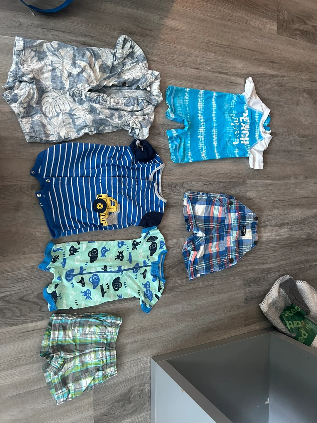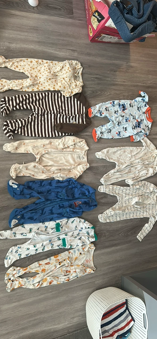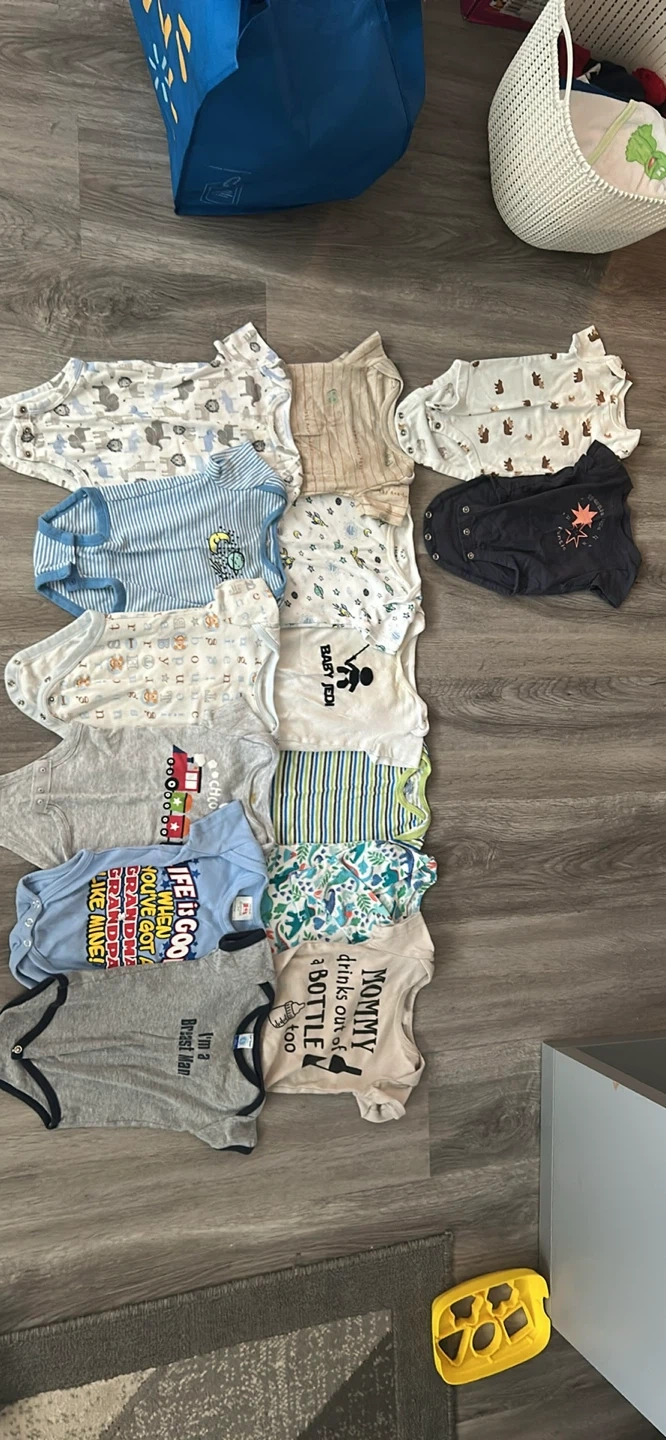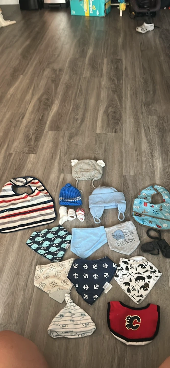 Carrier, bumper pads, changing pad, blankets, towels, hats, mitts, socks, bibs, sleepers, undershirts, shirts, shorts, pants, short outfits, bathing suit, matching sets, hoodies. All used like new. 0-3 on the top and 3-6 on the bottom. For the matching sets and hoodies 0-3 on the left and 3-6 on the right.
