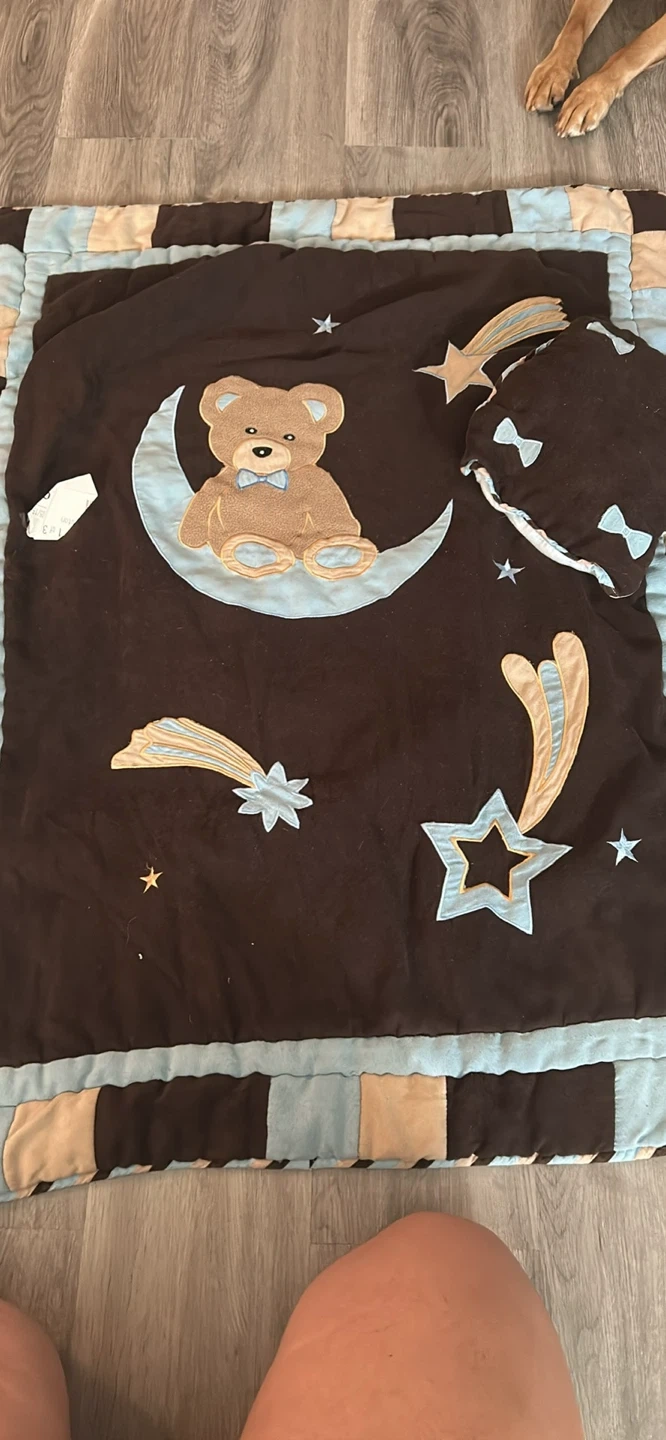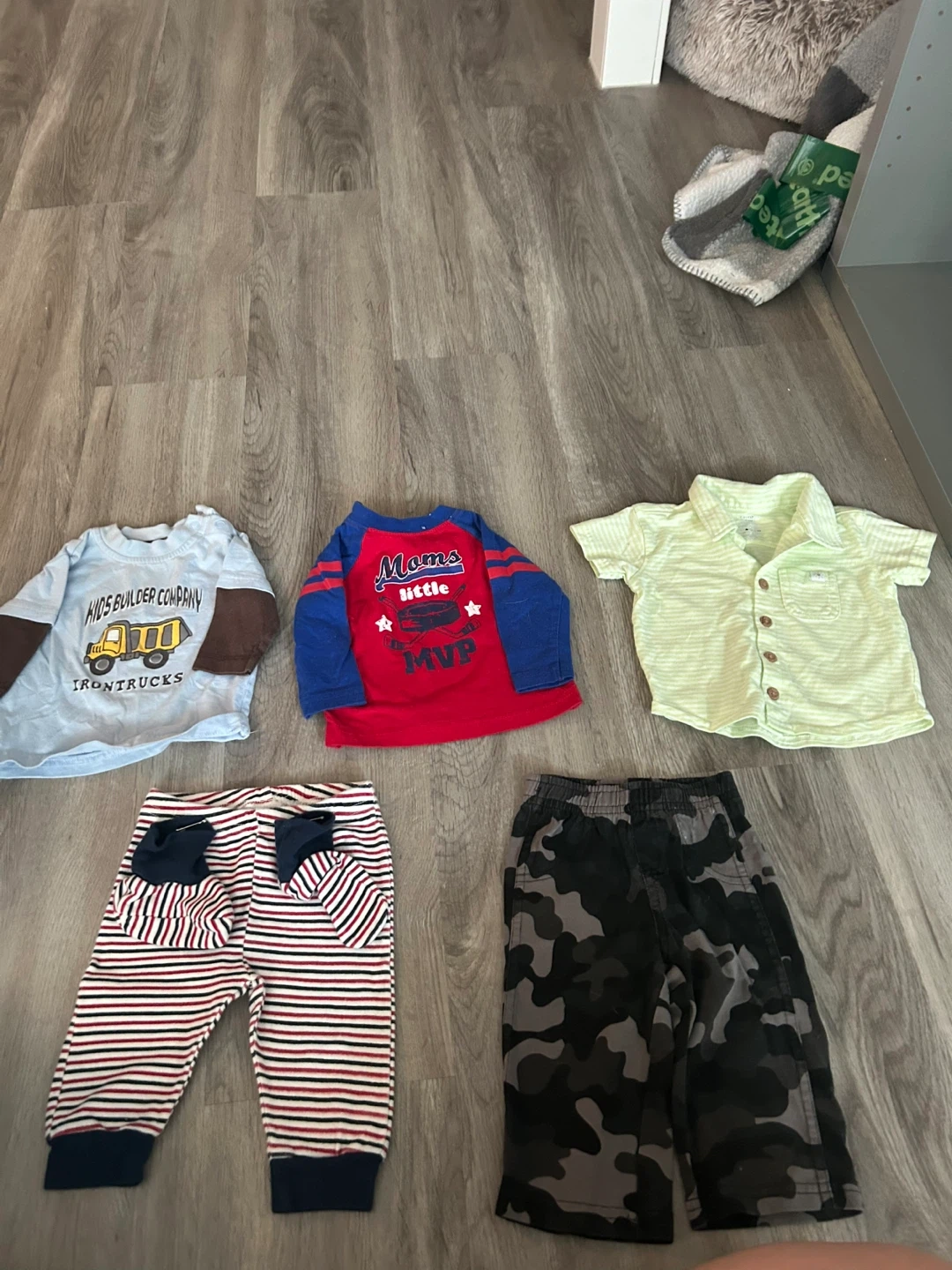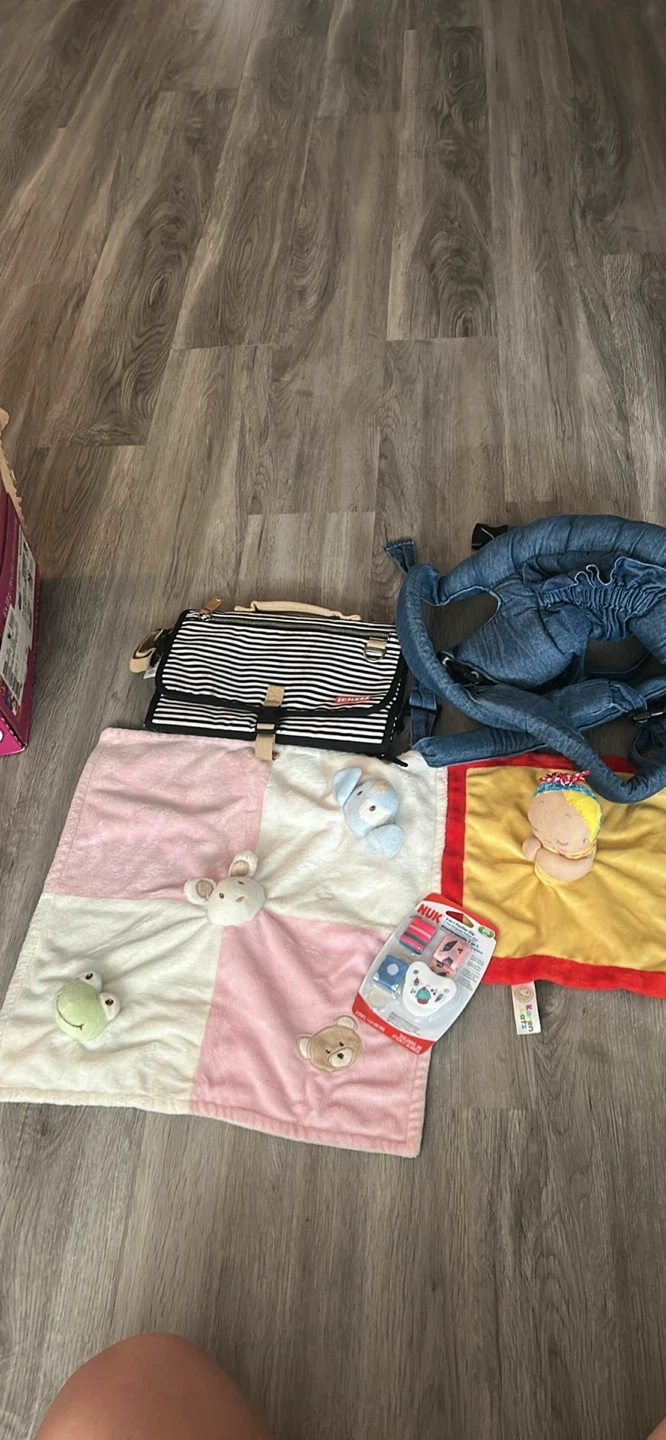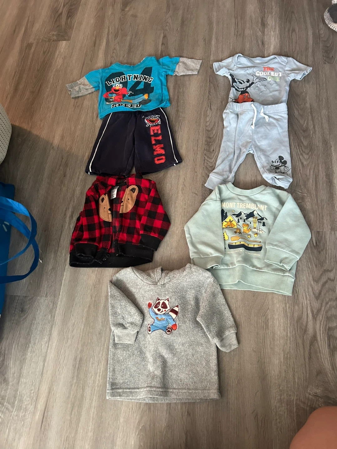 Carrier, bumper pads, changing pad, blankets, towels, hats, mitts, socks, bibs, sleepers, undershirts, shirts, shorts, pants, short outfits, bathing suit, matching sets, hoodies. All used like new. 0-3 on the top and 3-6 on the bottom. For the matching sets and hoodies 0-3 on the left and 3-6 on the right.