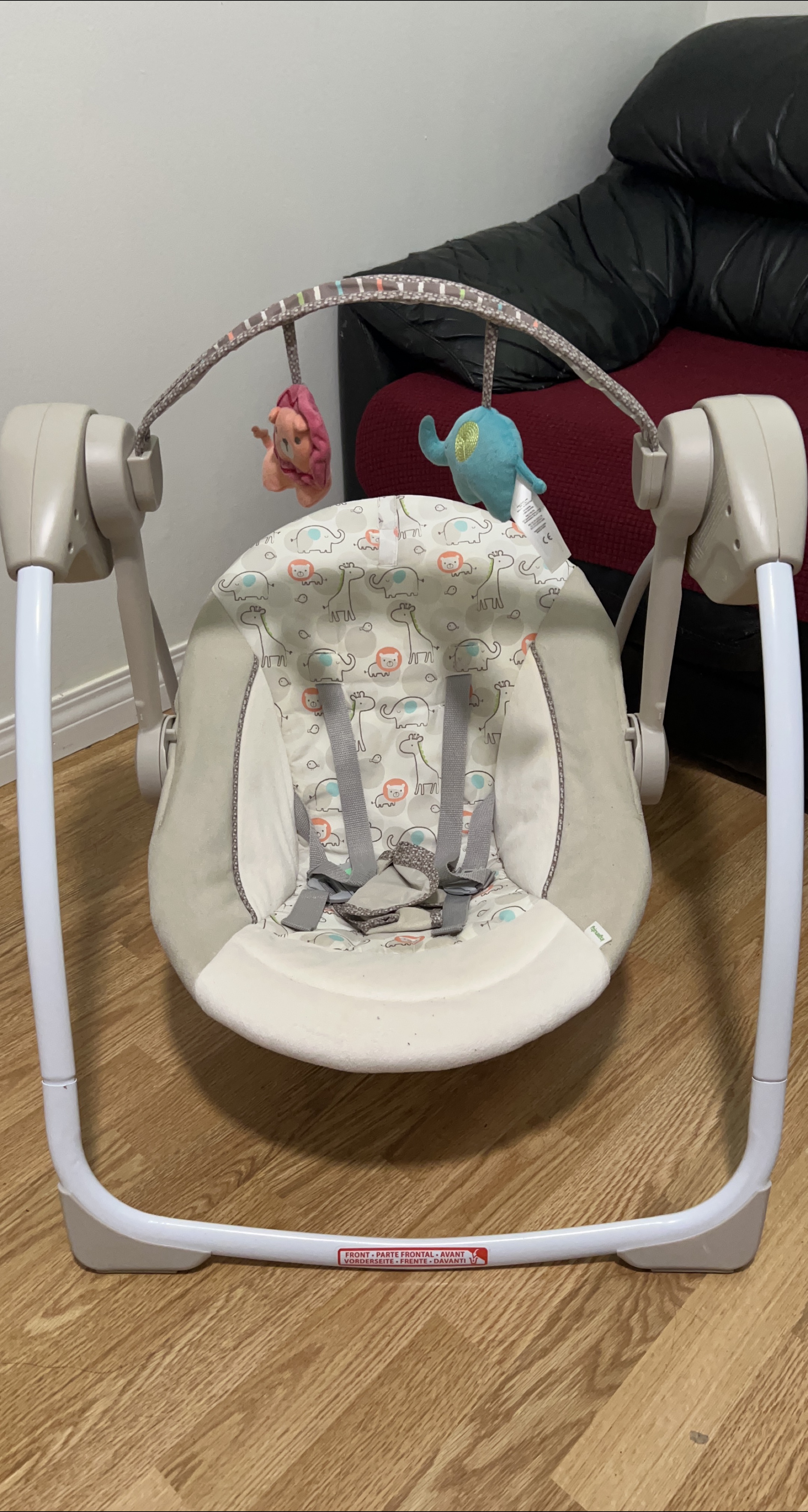 5Adorable swing for your little one. Neutral colour scheme with a cute animal print. A mobile with hanging toys is attached. This swing would be perfect for soothing your baby to sleep. • baby swing for ages 0-9 months • min. weight 6 lbs • max weight 20 lbs • 6 swing speeds • 6 original melodies with volume control and auto shut off