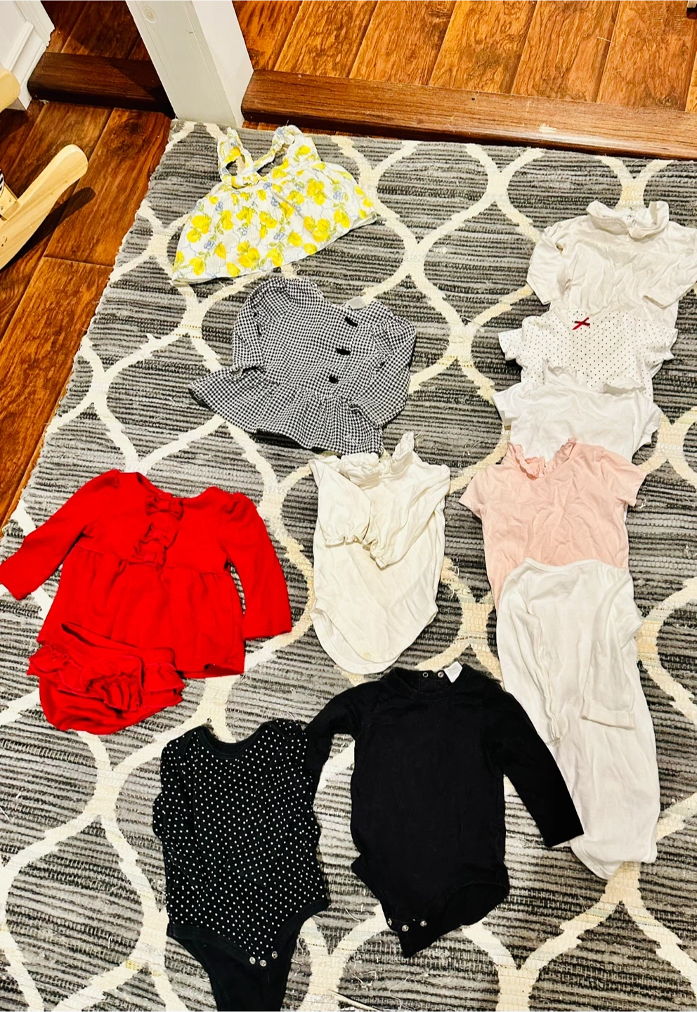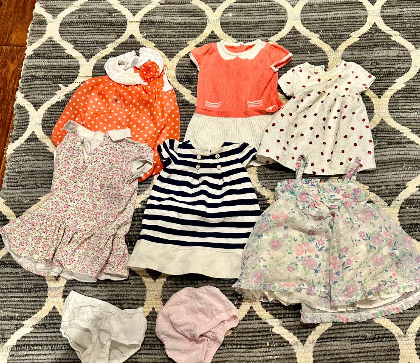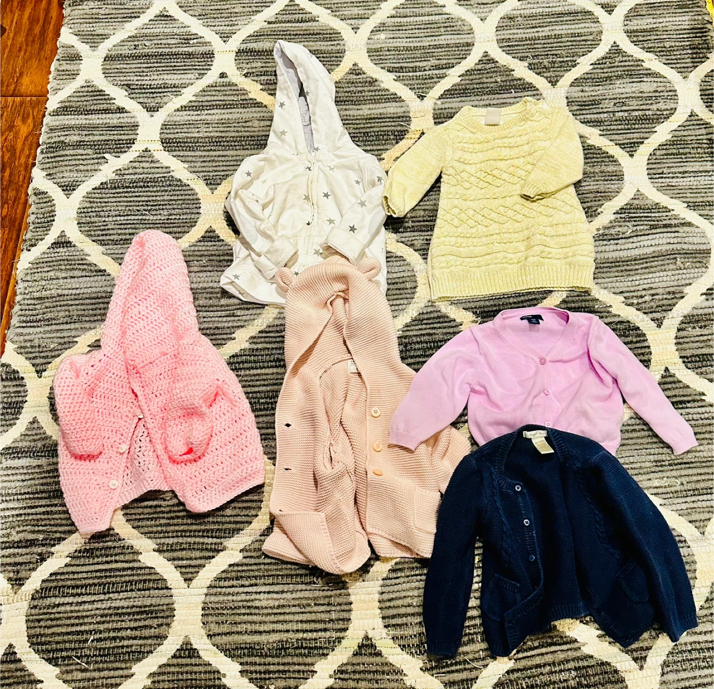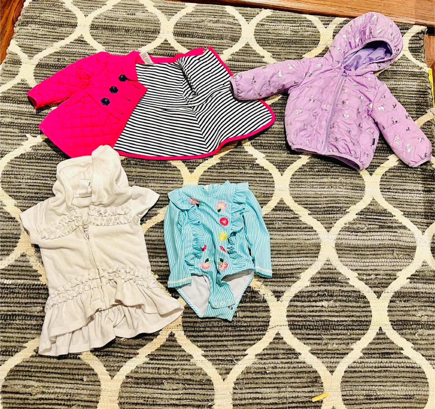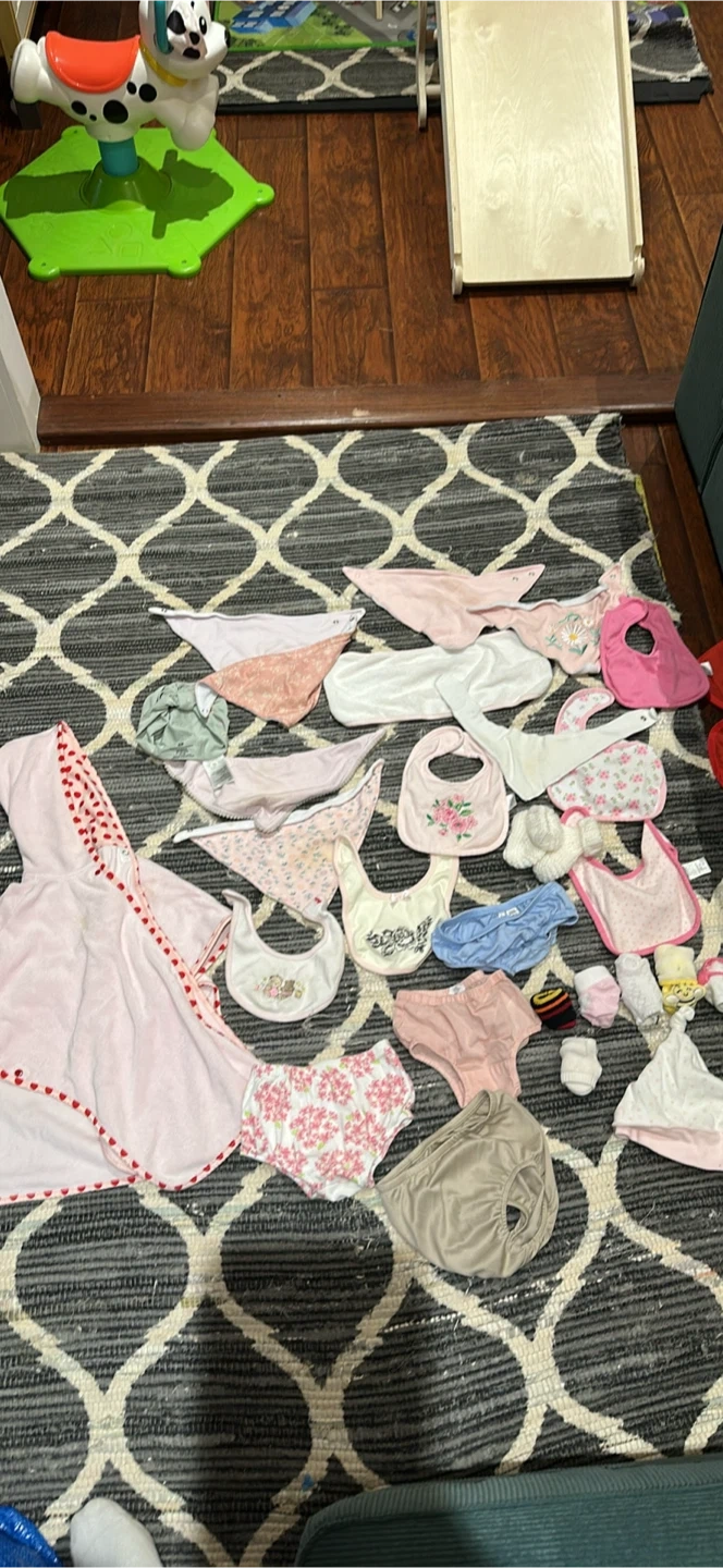 Clothing lot 6-12 month - long sleeve shirts with beautiful collar - short sleeve shirts with beautiful collar - Janie and jack dresses - Ralph Lauren dress - Calvin Klein shirt - Gap Knit Sweater with ears - Navy blue classic knit - pink old navy - Gap gold long dress knit - white hoody with stars and elbow patches - Joe Fresh Puffer Jacket with silver unicorns - Pink with Navy and white stripped fall jacket - bathing suits cover up - gorgeous blue and white stripped bathing suit with stitched flowers - Oshkosh lined overalls - shorts - 11 pairs of pants - 9 onises - socks - bibs - towel -hat X2 Little knit botties Pick up : M4C 2E4 East York by Micheal Garron Hospital on Sammon Avenue Cash Only