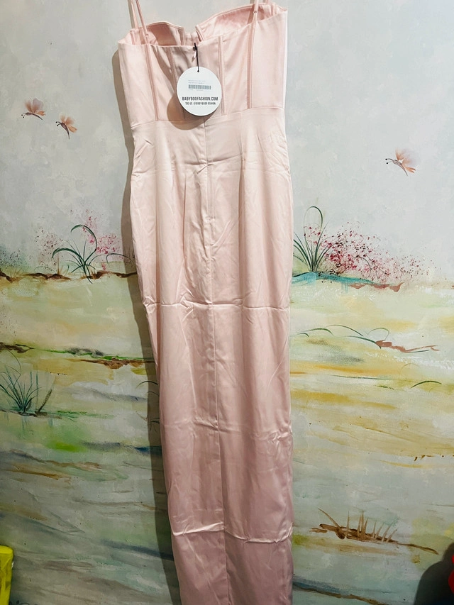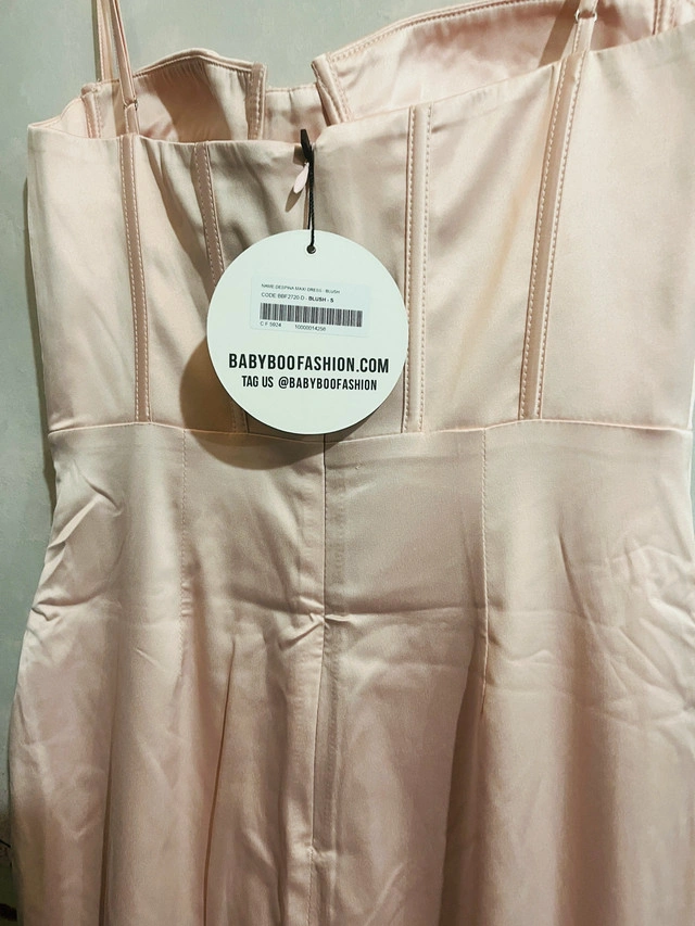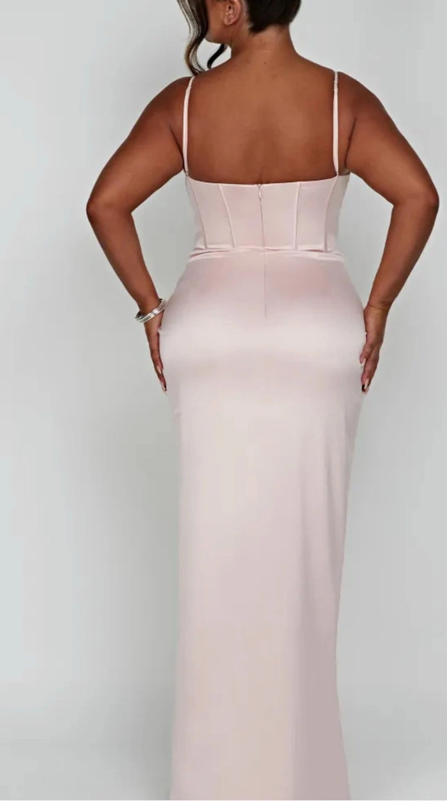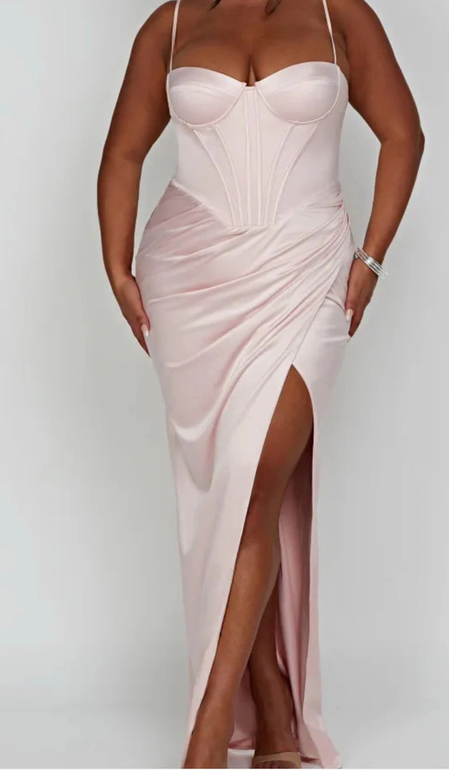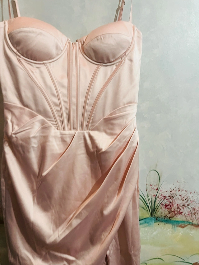 118This brand new Despina maxi is a stunning choice for balls, formals, weddings and proms this season. Cut from luxury heavy satin with a stretch to skim over curves, this dreamy design is complete with a corset waist, thigh split, drape detail and underwired cups to lift and frame the bust. Style with a sleek, high knot and platforms. Colour: Blush Luxury heavy stretch satin. Thigh high split. Skims over figure. Underwired bust. Corset waist. Drape detail. Maxi length. Retail price over $140 Pickup is in Brampton near Sheridan College.