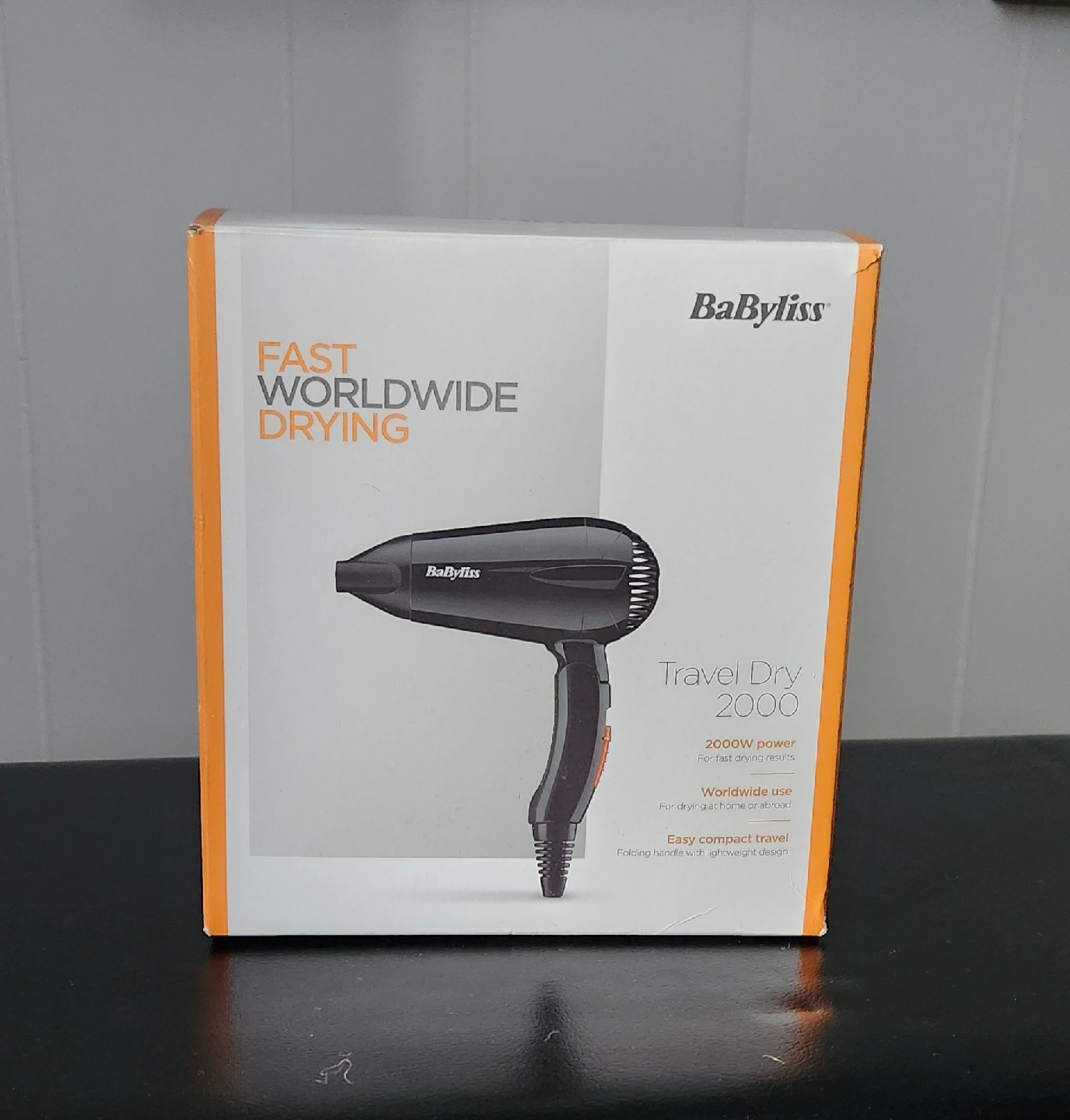 Babyliss Travel Dry 2000. It's perfect for travel with its lightweight and compact design, featuring a folding handle for easy storage.