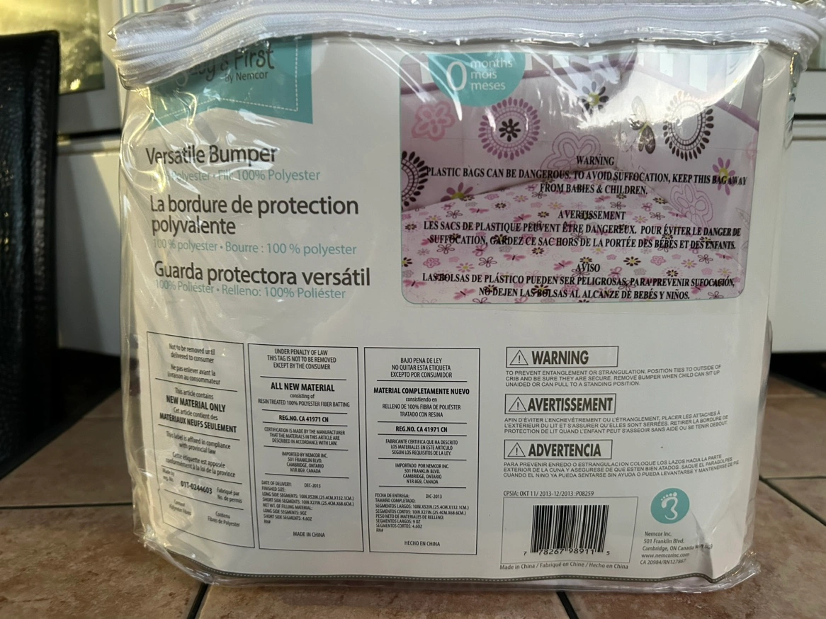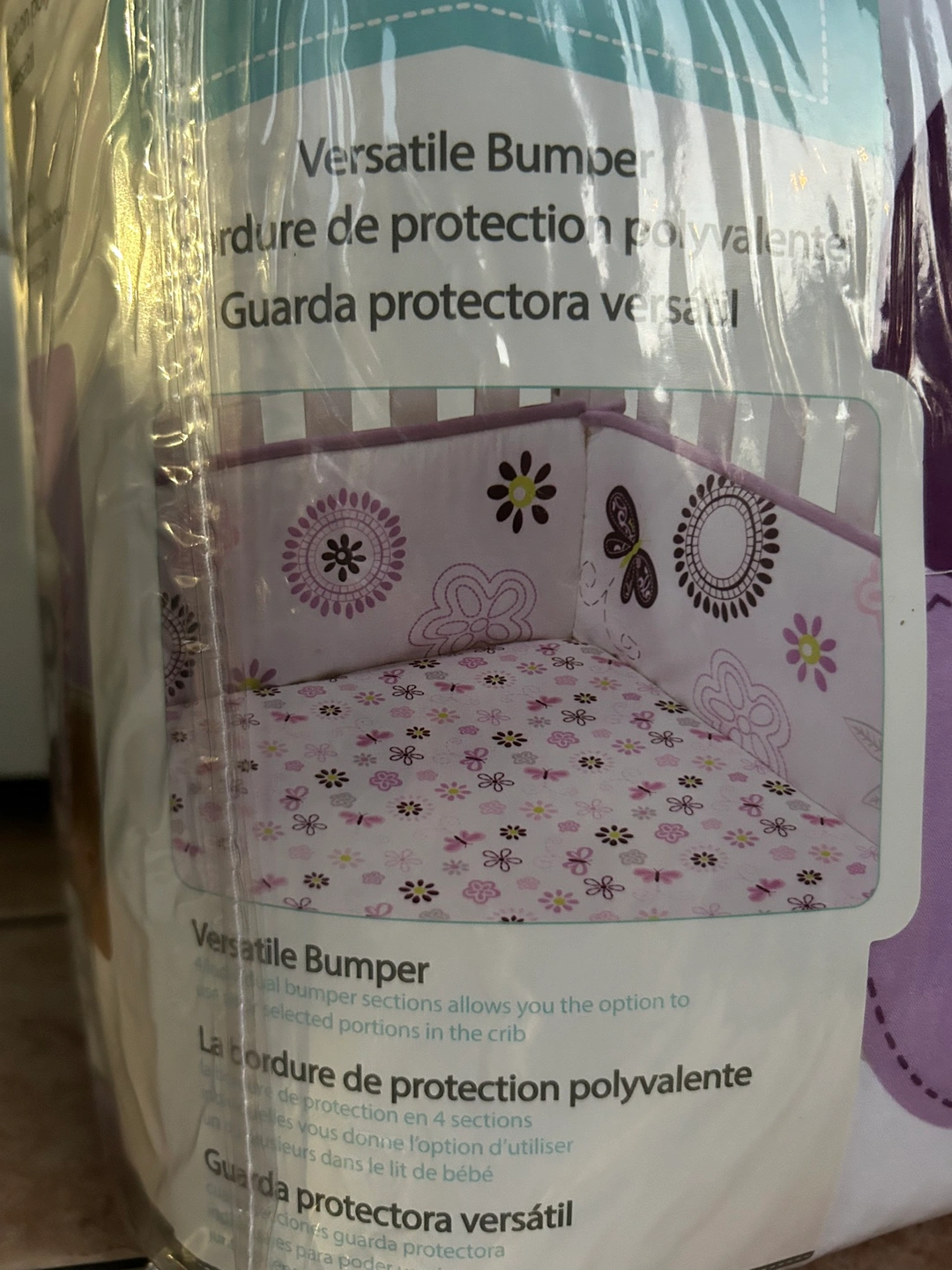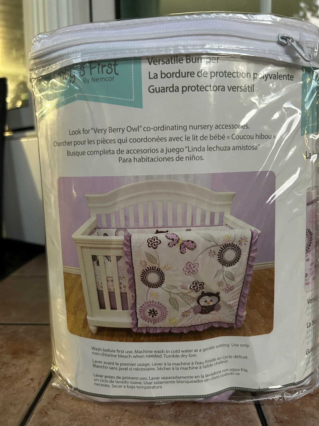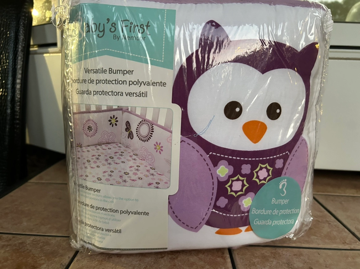 134Baby's First brand crib bumper featuring an owl print and purple/pink floral details.