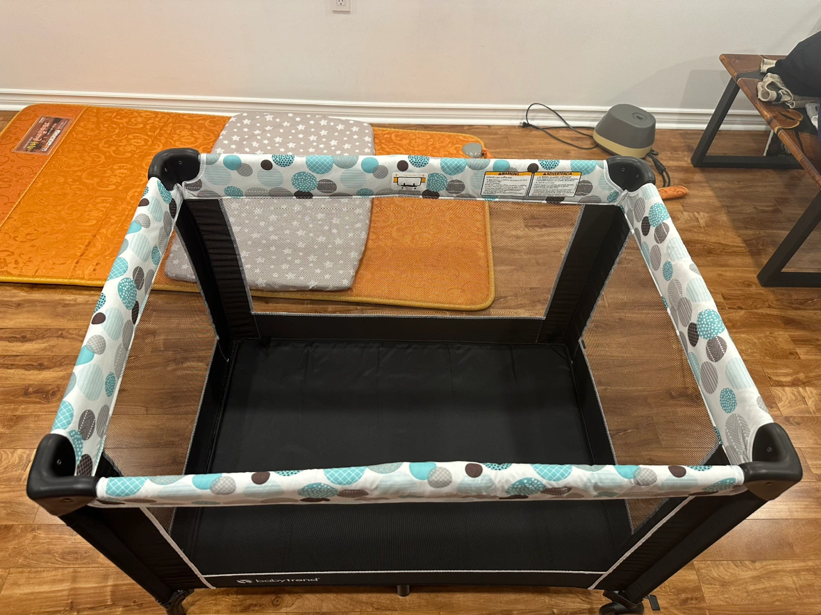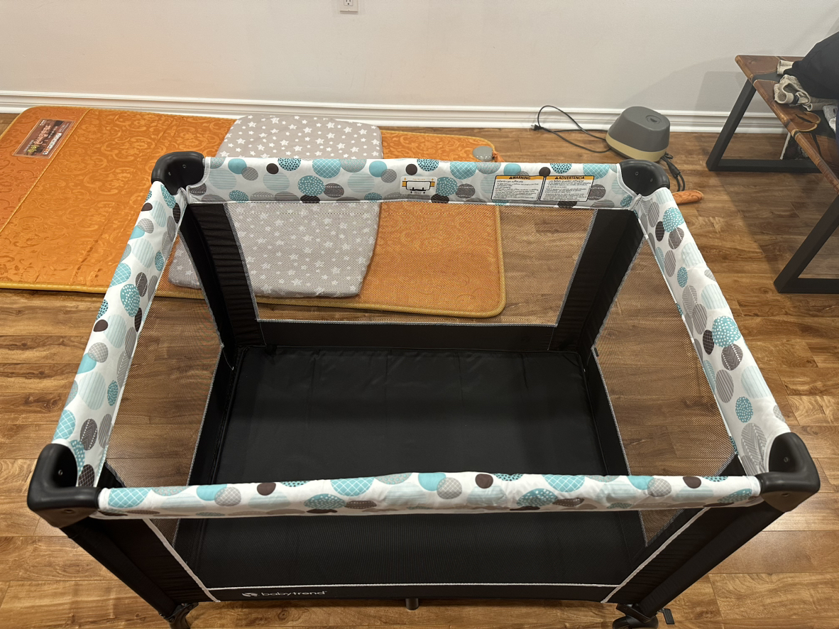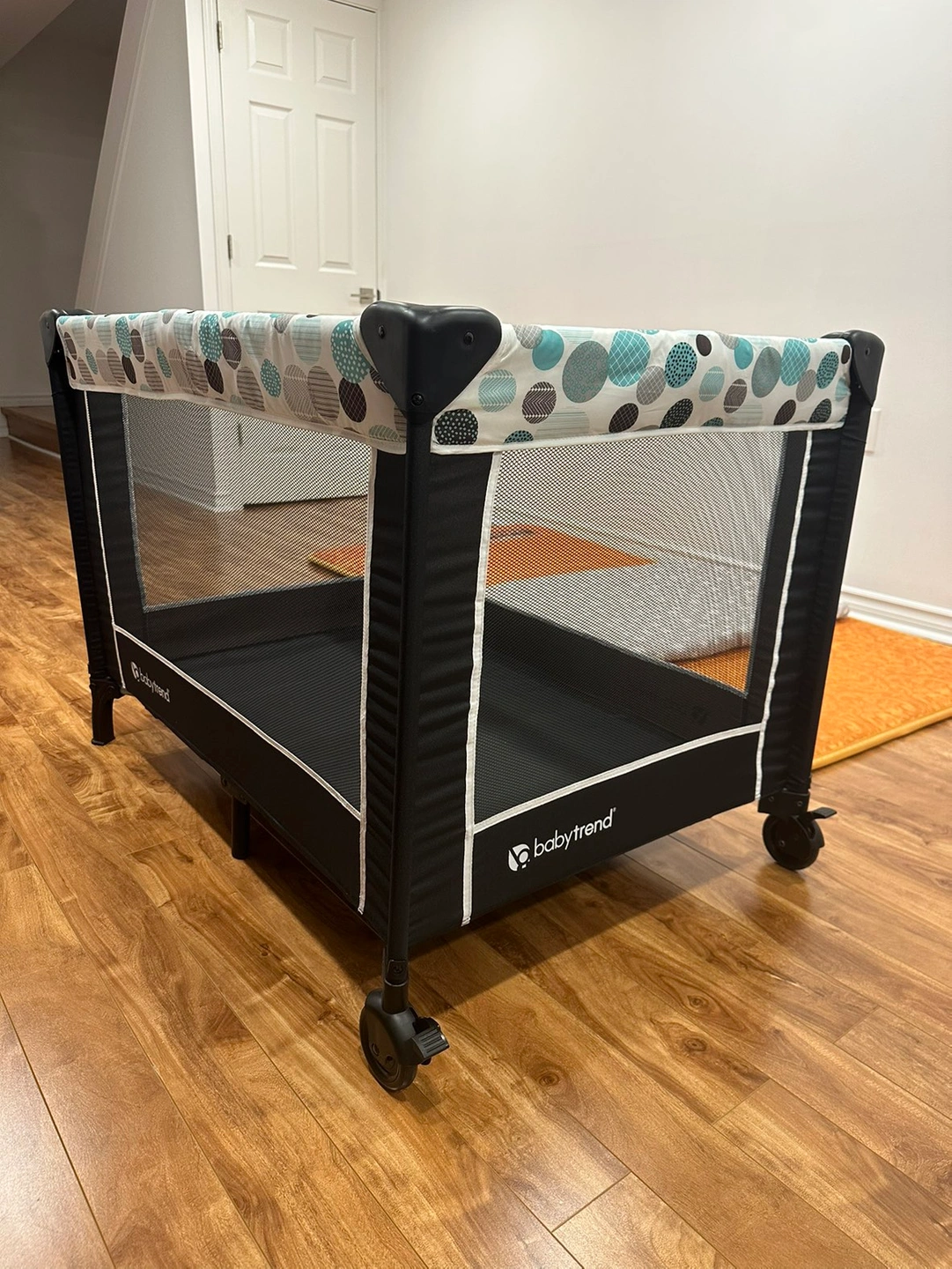 Perfect playpen for traveling or to leave it at grandmothers house during the visit. Even for camping :) I used it for my babies grandmother visit, it was only used few times as we didn’t visit much but during the visit baby took a nap inside and it was perfect. The condition of the playpen is like new with not a single scratch. It is from pet & smoke free house. I am selling with single waterproof mattress but the playpen itself has a hard floor inside the playpen.