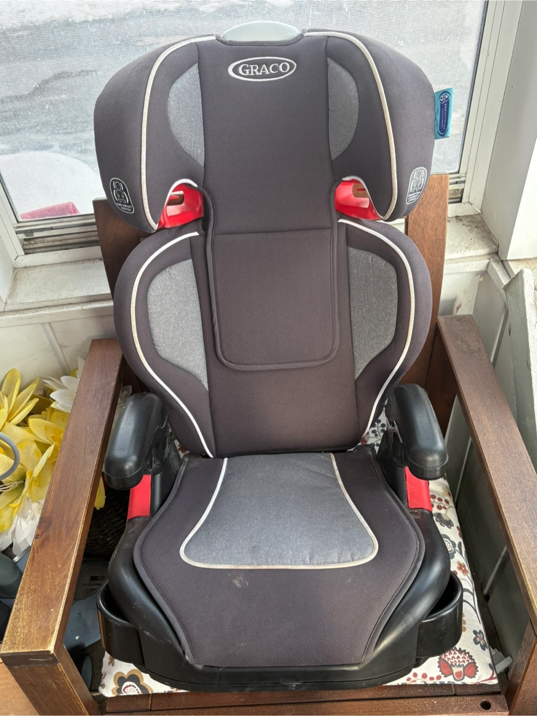 This Graco booster car seat is grey and black with red accents. It features adjustable head support and padded armrests. It has a built-in cup holder for convenience.
