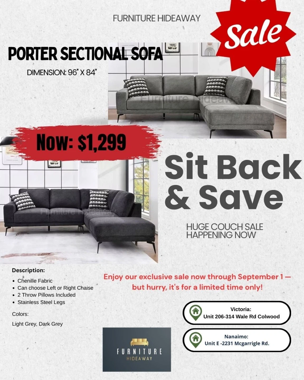 Upgrade your living space with the Porter Sectional Sofa – now on Back to School Sale! ✔️ Soft chenille fabric ✔️ Left or right chaise option ✔️ 2 throw pillows included ✔️ Sleek stainless steel legs 🛋️ Dimensions: 96" x 84" 🎨 Available in Light Grey or Dark Grey ⁠ Limited time only – sale ends September 1st! 📍Victoria: Unit 206-314 Wale Rd Colwood