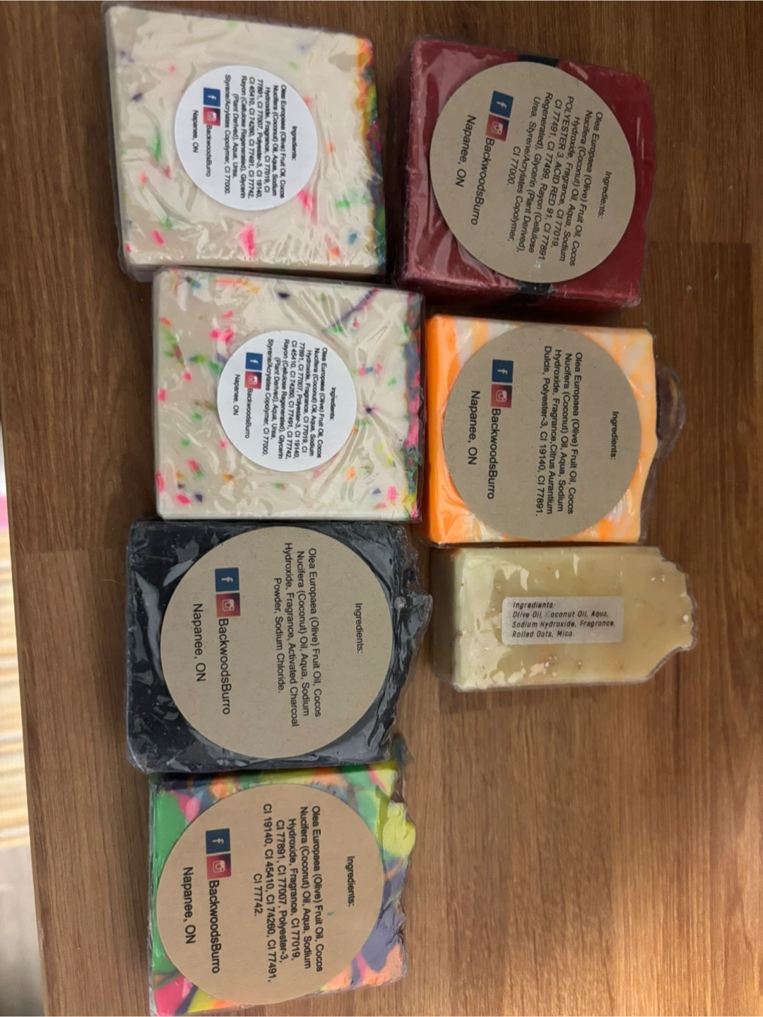 1000+Price for all 7 handmade soap bars. Selling a variety pack of Backwoods Burro Artisan Soaps! Each bar is handmade with care in Napanee, ON. You'll find unique scents and designs in this collection of handcrafted soaps. Perfect for adding a touch of local artisan charm to your daily routine