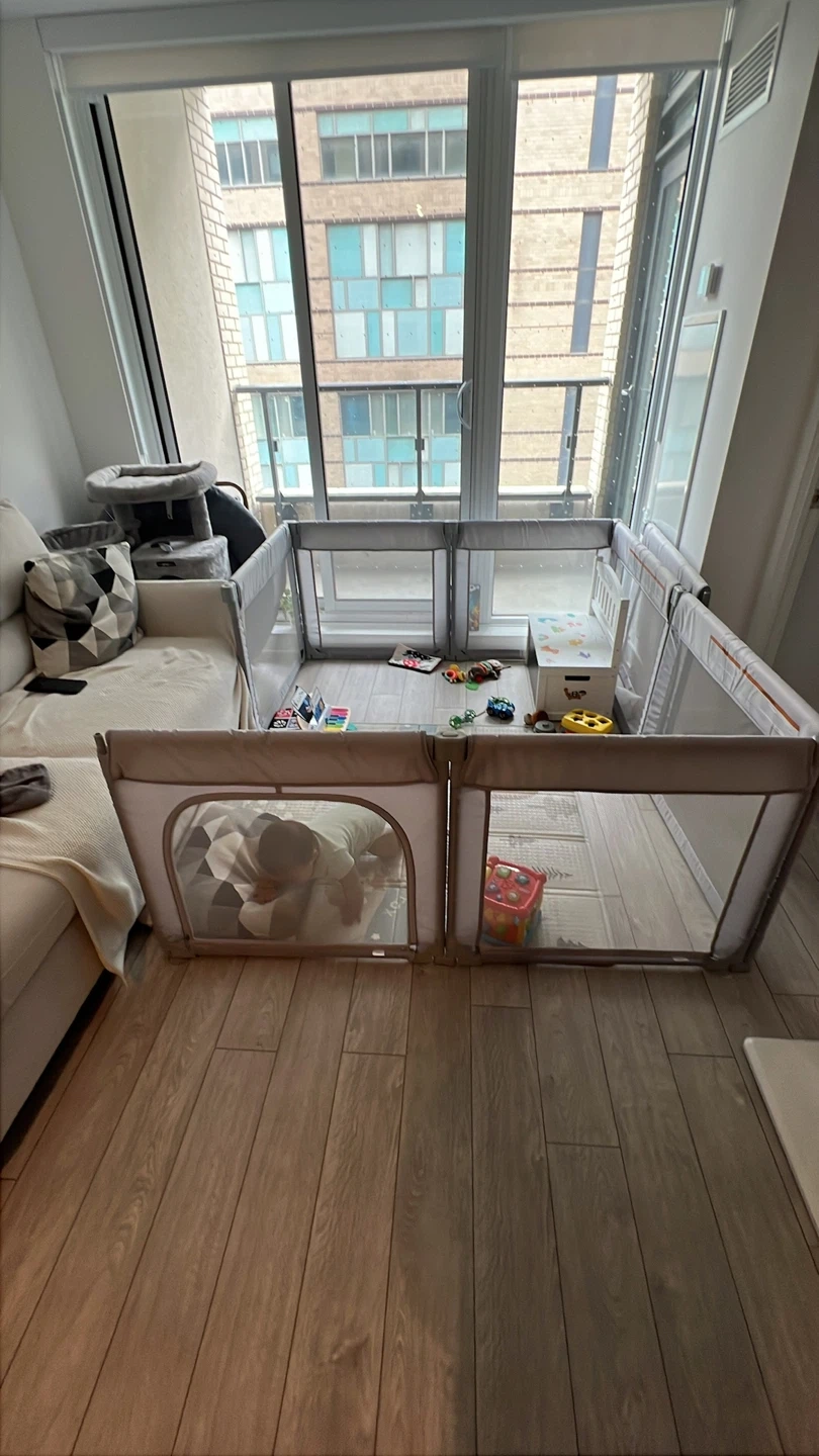 This grey folding playpen is adjustable and can be configured in various shapes. It's made with breathable mesh and a sturdy frame for safety. Perfect for keeping little ones contained and entertained!
