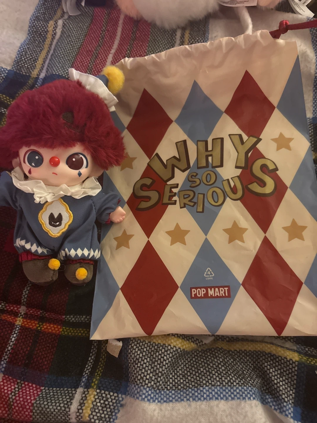 This is a "Why So Serious" clown plush toy from Pop Mart. It features a distressed expression with tear streaks and a fluffy red wig. The plush toy comes with its original drawstring bag. Dimoo. Wellington and Halsted here. Zelle or cash.