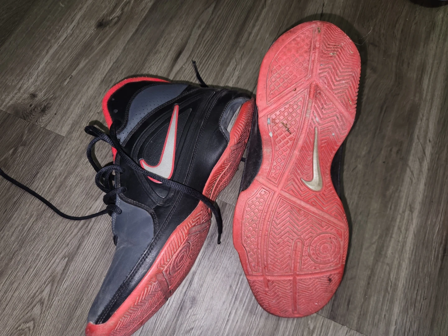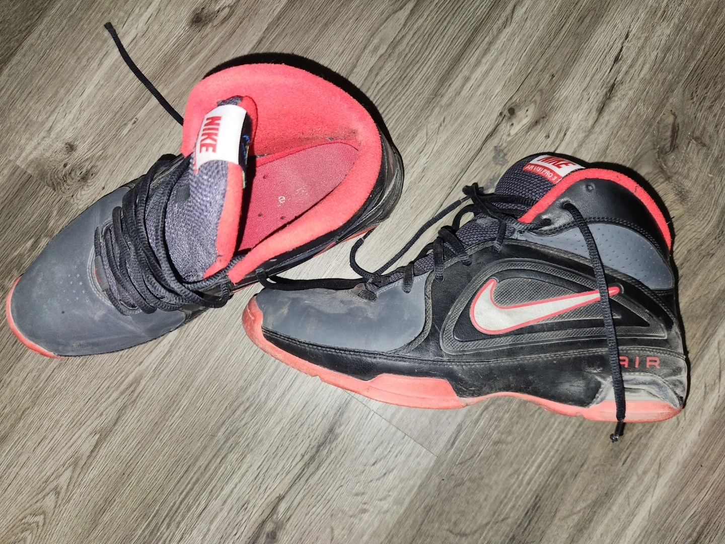 Nike Air Visi Pro 3 basketball shoes in black and red. Men's athletic footwear with laces. These shoes offer ankle support for active play.